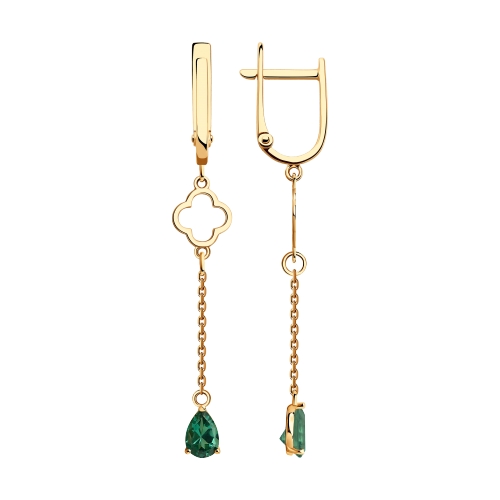 Утонченные длинные серьги с подвесками с ситаллами и модными акцентами в виде четырехлистника выполнены из красного золота 585 пробы. Легкие серьги очаровательного дизайна станут идеальным аксессуаром на каждый день, также подойдут для вечернего наряда, и отлично дополнят нежный женственный образ. Приобретайте актуальное украшение выгодно в магазинах Мир Золота.