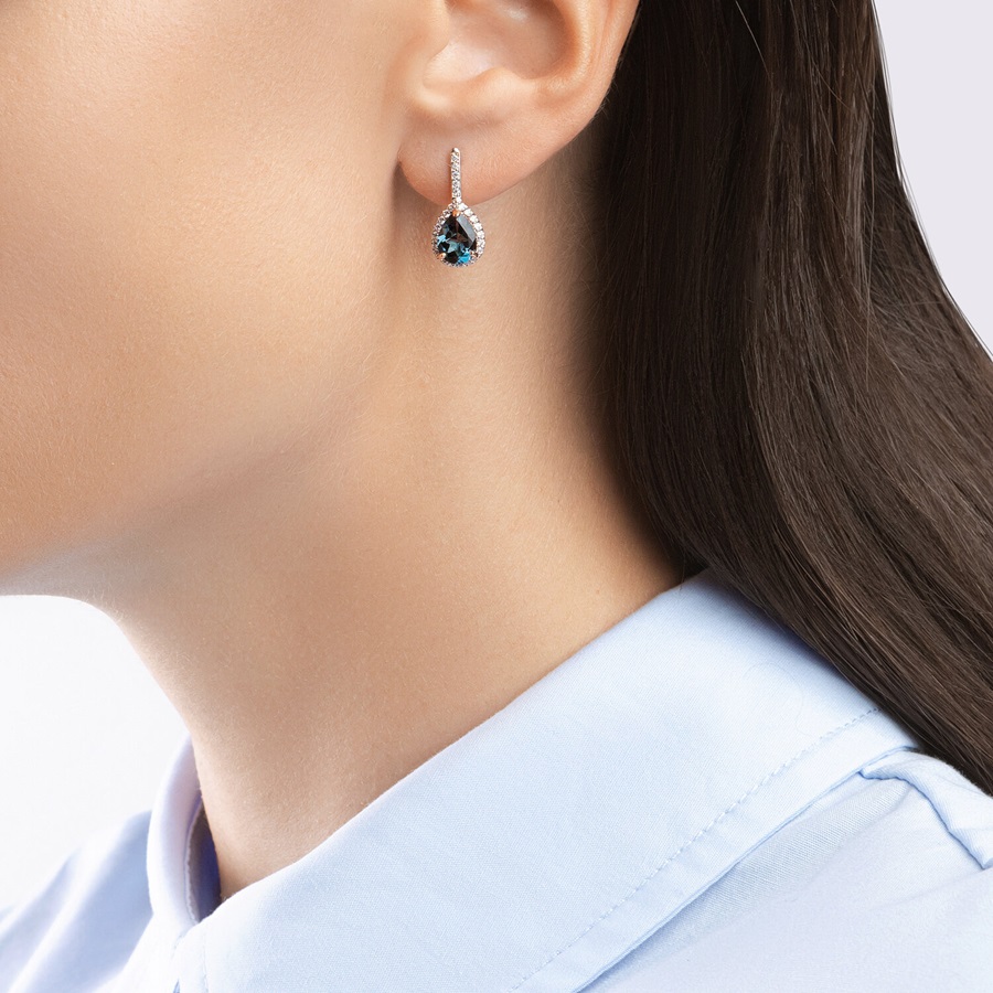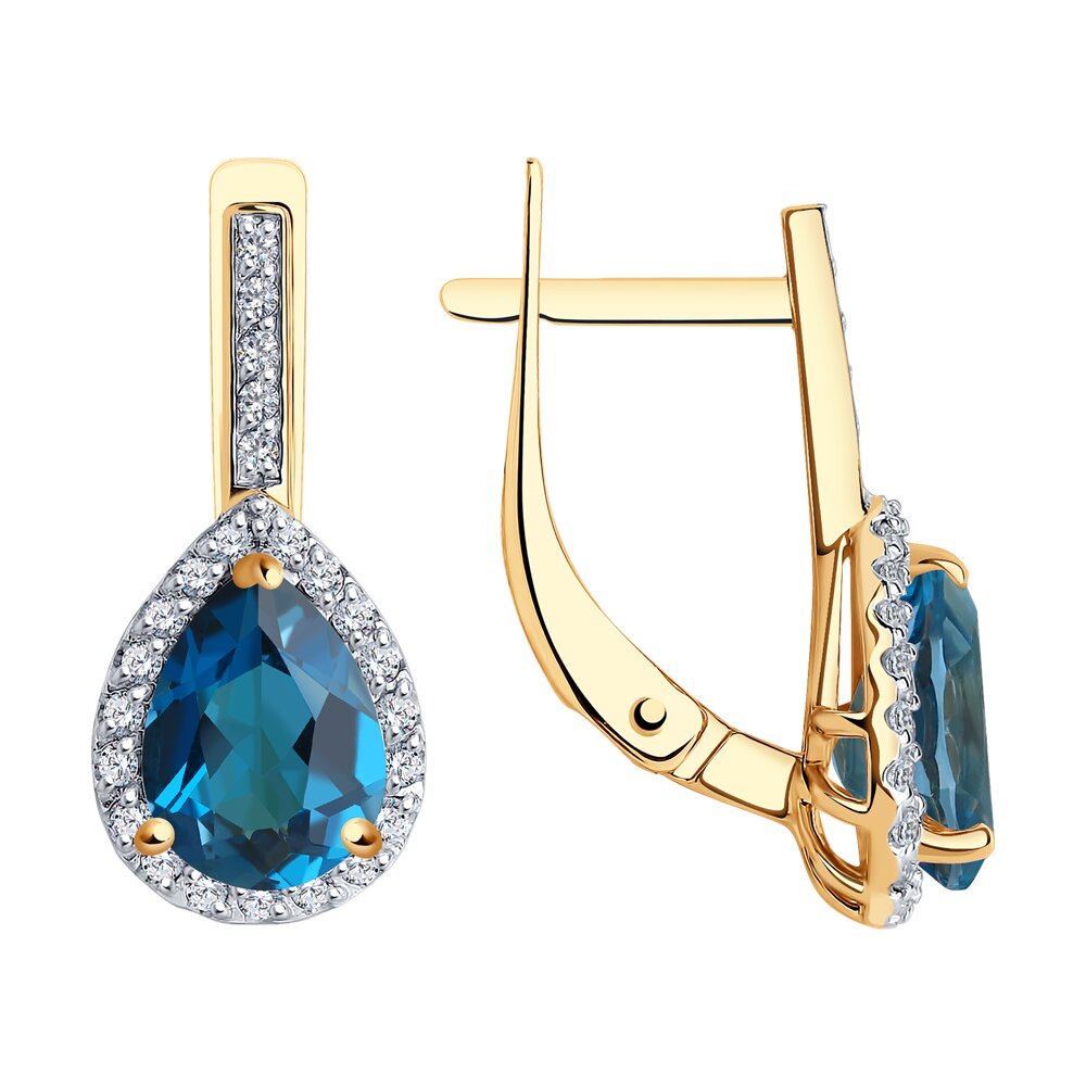 Серьги классического дизайна с натуральными топазами глубокого насыщенного цвета в окружении сияющих фианитов выполнены из красного золота 585 пробы. Превосходное украшение с лондон топазами привлекательной каплевидной формы огранки очень женственно и нарядно смотрится, и наполнит образ владелицы изысканным блеском и очарованием. Приобретайте серьги по выгодной цене в магазинах Мир Золота.