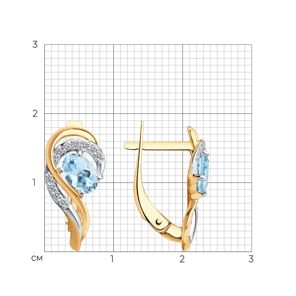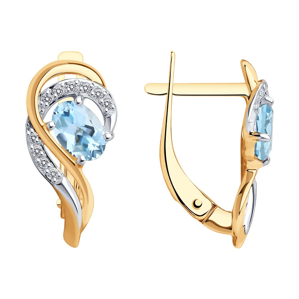 Серьги изящного дизайна с нежным блеском натуральных голубых топазов и фигурными дорожками с прозрачными фианитами выполнены из красного золота 585 пробы. Привлекательный аксессуар с изысканным сиянием ювелирных камней эффектно украсит очаровательный женский образ, и будет замечательным подарком по любому поводу. Приобретайте серьги по выгодной цене в магазинах Мир Золота.