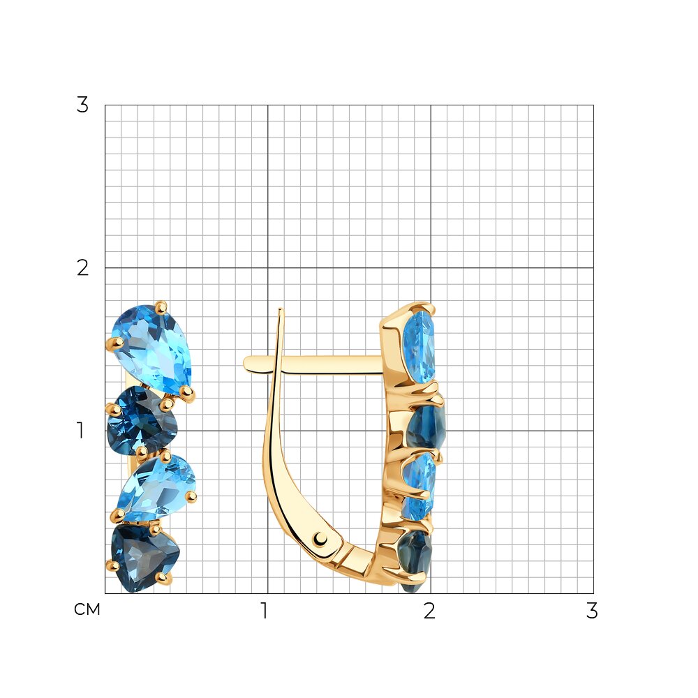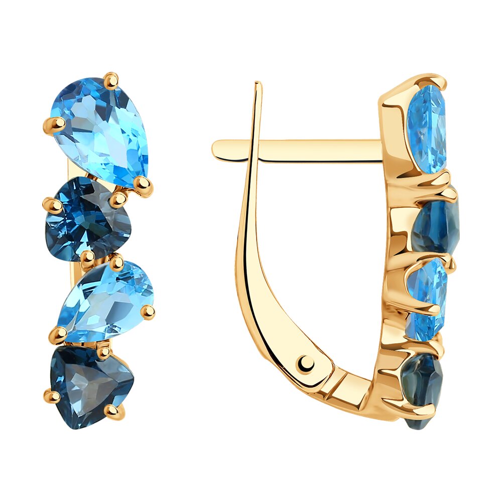 Привлекательные серьги с миксом натуральных топазов выполнены из красного золота 585 пробы. Нежная композиция из голубых и синих топазов завораживает своим очаровательным сиянием, и сделает женский образ более изысканным и притягательным. Украшение будет идеальным подарком, подчеркивающим красоту и женственность владелицы. Приобретайте серьги по выгодной цене в магазинах Мир Золота.