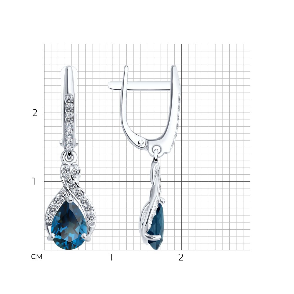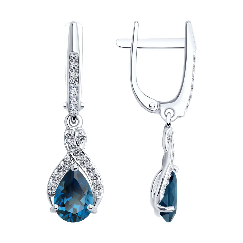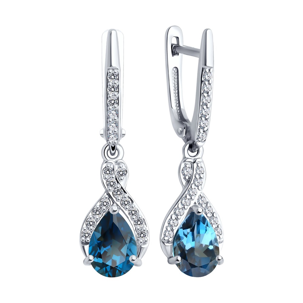 Серьги с подвесками, из белого золота 585 пробы, с привлекательными топазами Лондон и сверкающими дорожками с фианитами не останутся незамеченными. Очень женственное и нарядное украшение с ярким насыщенным блеском ювелирных камней, завораживает взгляд, и будет радовать вас своим безупречным сиянием. Тип замка - английский, надёжно зафиксирует украшение. Приобретайте серьги по выгодной цене в магазинах Мир Золота.