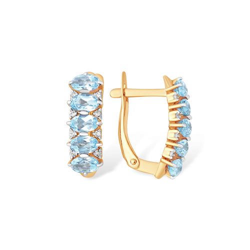 Изысканные серьги из красного золота 585 пробы декорированы натуральными голубыми топазами, подчеркнутыми сияющими вставками с прозрачными фианитами. Эффектная композиция из ювелирных камней привлекает внимание, покоряя своей красотой и нежным блеском. С этим стильным аксессуаром вы легко сможете создать свой идеальный образ. Покупайте ювелирное украшение по выгодной цене в магазинах Мир Золота.