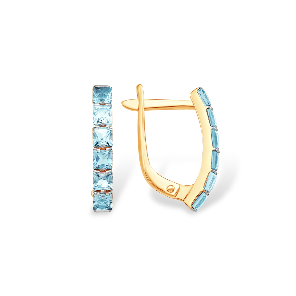 Серьги с дорожками из натуральных голубых топазов квадратной формы огранки выполнены из красного золота 585 пробы. Привлекательные серьги с изумительным блеском прекрасных топазов аккуратно и стильно смотрятся, и станут изысканным акцентом современного образа владелицы. Приобретайте серьги с комфортным английским замком для себя или в подарок, выгодно в магазинах Мир Золота.