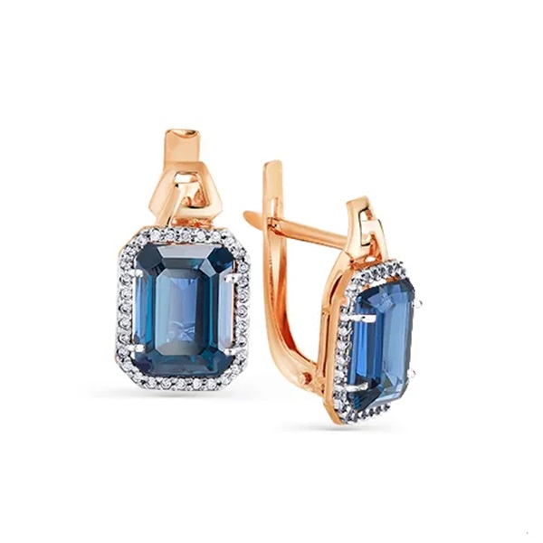 Превосходные серьги на английском замке выполнены из красного золота 585 с крупными лондон топазами насыщенного оттенка в окружении кристальных фианитов. Классическое украшение с ярким акцентом камней достойно смотрится, и великолепно дополнит классический или элегантный вечерний образ. Приобретайте ювелирное украшение в подарок по выгодным ценам в магазинах Мир Золота.