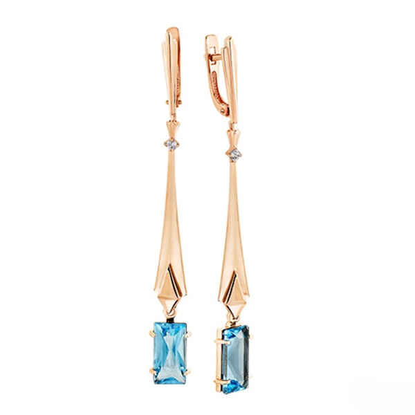 Элегантные длинные серьги с подвесками с натуральными топазами выполнены из красного золота 585 пробы. Утонченное украшение с удивительным блеском лазурных топазов swiss выразительной формы огранки смотрится стильно и современно, и станет изысканным акцентом женского образа. Тип замка: английский. Приобретайте превосходные серьги в подарок выгодно в магазинах Мир Золота.