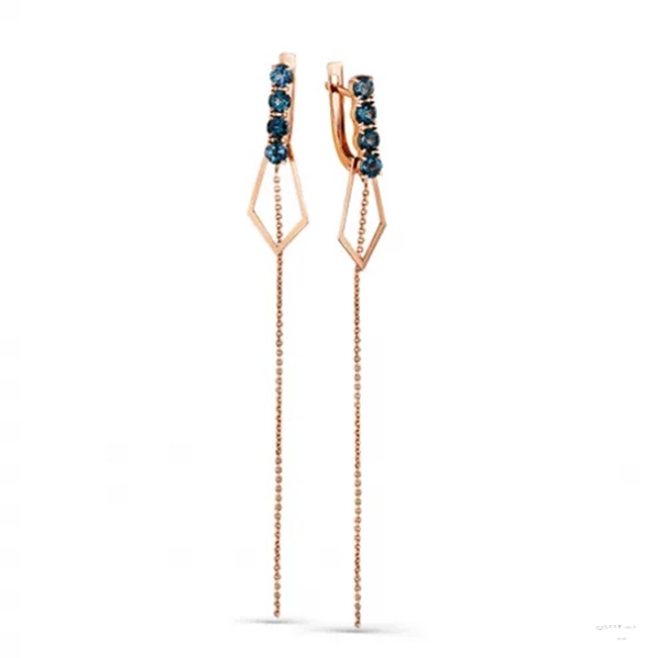 Длинные серьги с подвесками с Лондон топазами выполнены в утонченном дизайне из красного золота 585 пробы. Серьги с завораживающим блеском полудрагоценных камней очень женственно и стильно смотрятся, и станут изысканным акцентом современных образов обладательницы. Тип замка - английский, надежно зафиксирует украшение. Приобретайте серьги выгодно в магазинах Мир Золота.