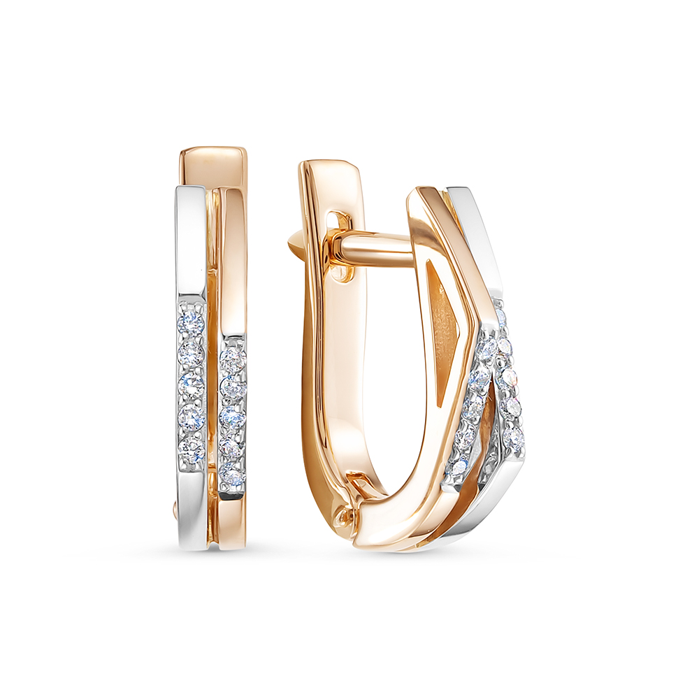 Серьги современного ювелирного дизайна выполнены из красного и белого золота 585 пробы с дорожками сияющих бриллиантов. Актуальный дизайн в сочетании с природной красотой натуральных камней покоряет с первого взгляда, и станет стильным дополнением повседневного и праздничного образа. Тип замка - английский. Приобретайте ювелирное украшение по выгодной цене в магазинах Мир Золота.