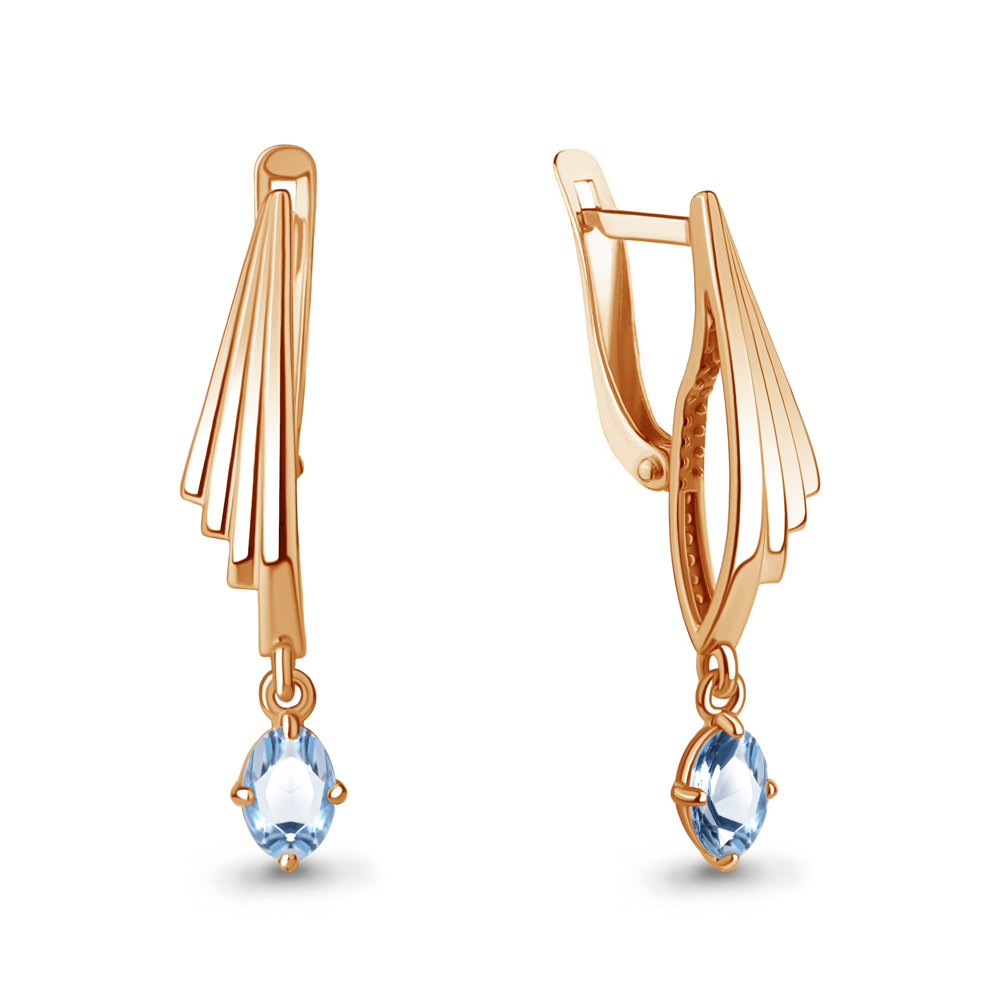 Серьги с подвесками с голубыми топазами swiss выполнены в стильном дизайне из красного золота 585 пробы. Яркий акцент привлекательных топазов насыщенного лазурного оттенка завораживает своей красотой, и позволит украшению стать изысканной деталью современных образов владелицы. Тип замка - английский, надежно зафиксирует украшение. Приобретайте серьги в подарок по выгодным ценам в магазинах Мир Золота.