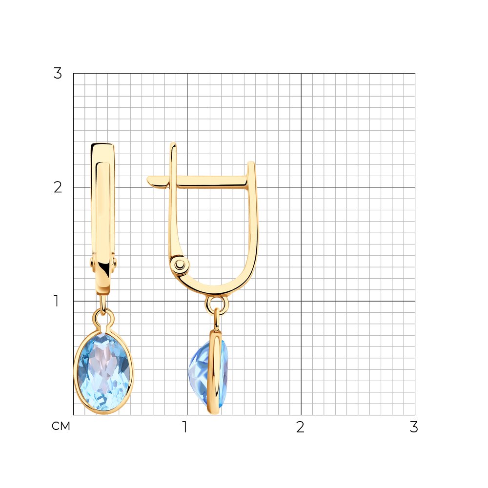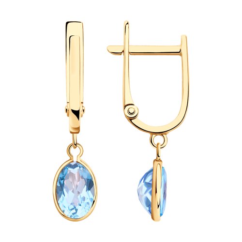 Серьги из красного золота 585 пробы с подвесками с натуральными голубыми топазами смотрятся очень изящно и элегантно. Нежное и женственное украшение с привлекательным блеском полудрагоценных камней будет универсальной моделью как для повседневного ношения, так и для вечернего образа. Комфортный английский замок надежно зафиксирует украшение. Приобретайте серьги в подарок выгодно в магазинах Мир Золота.