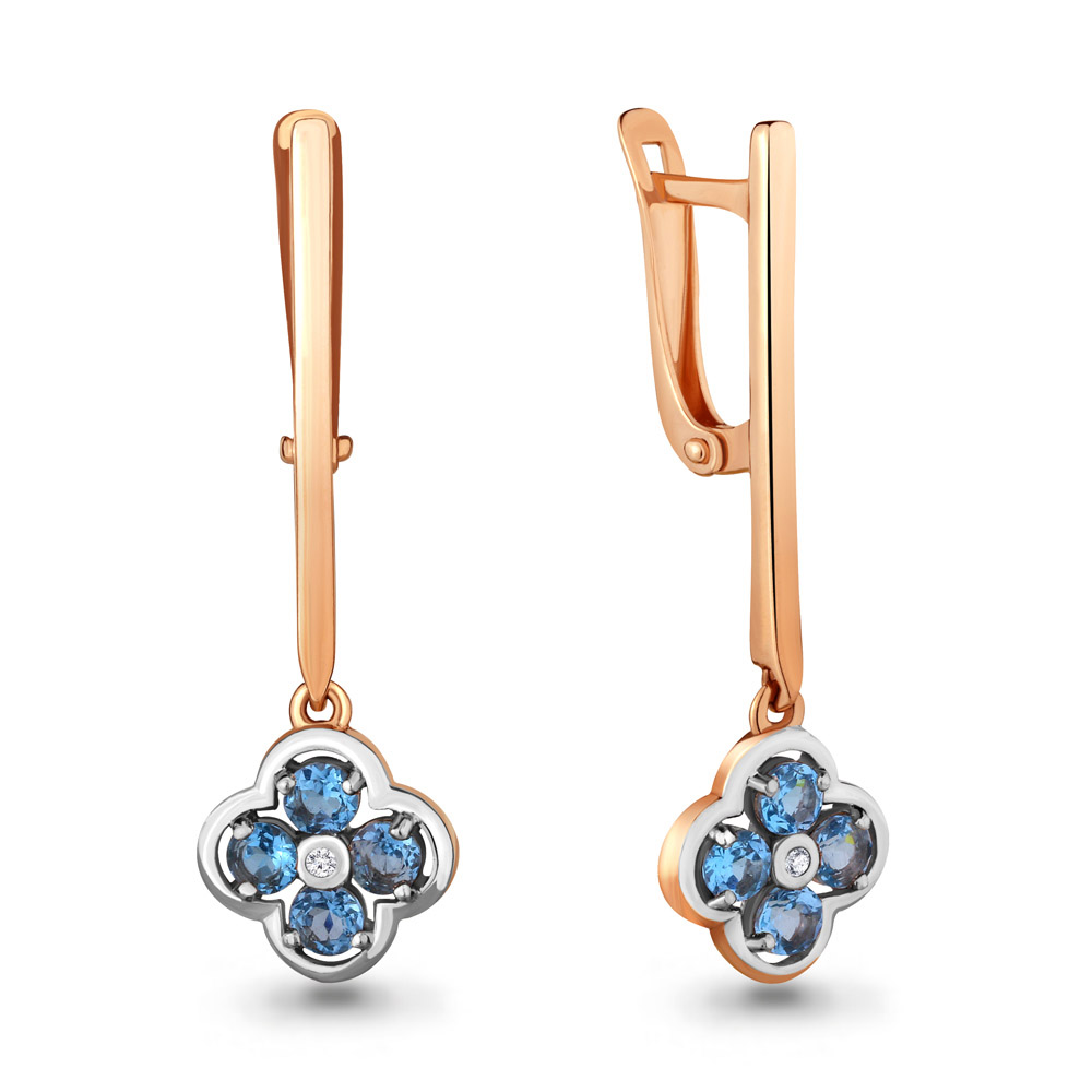 Удлиненные серьги с подвесками выполнены из красного золота 585 пробы и украшены яркой композицией из голубых топазов swiss blue и прозрачных фианитов. Насыщенный блеск ювелирных камней привлекает внимание, очаровательное украшение заметно разнообразит привычный повседневный образ, сделав его более нежным и романтичным. Приобретайте украшение в подарок для ваших любимых, по выгодной цене в магазинах Мир Золота.