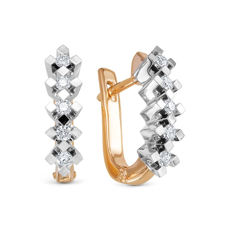 Стильные серьги современного дизайна с дорожками великолепных бриллиантов выполнены из красного и белого золота 585 пробы. Эффектные вставки с ослепительным блеском натуральных камней привлекают внимание, украшение оригинально смотрится, и отлично дополнит актуальные образы владелицы. Приобретайте серьги с комфортным английским замком по привлекательной цене в магазинах Мир Золота.