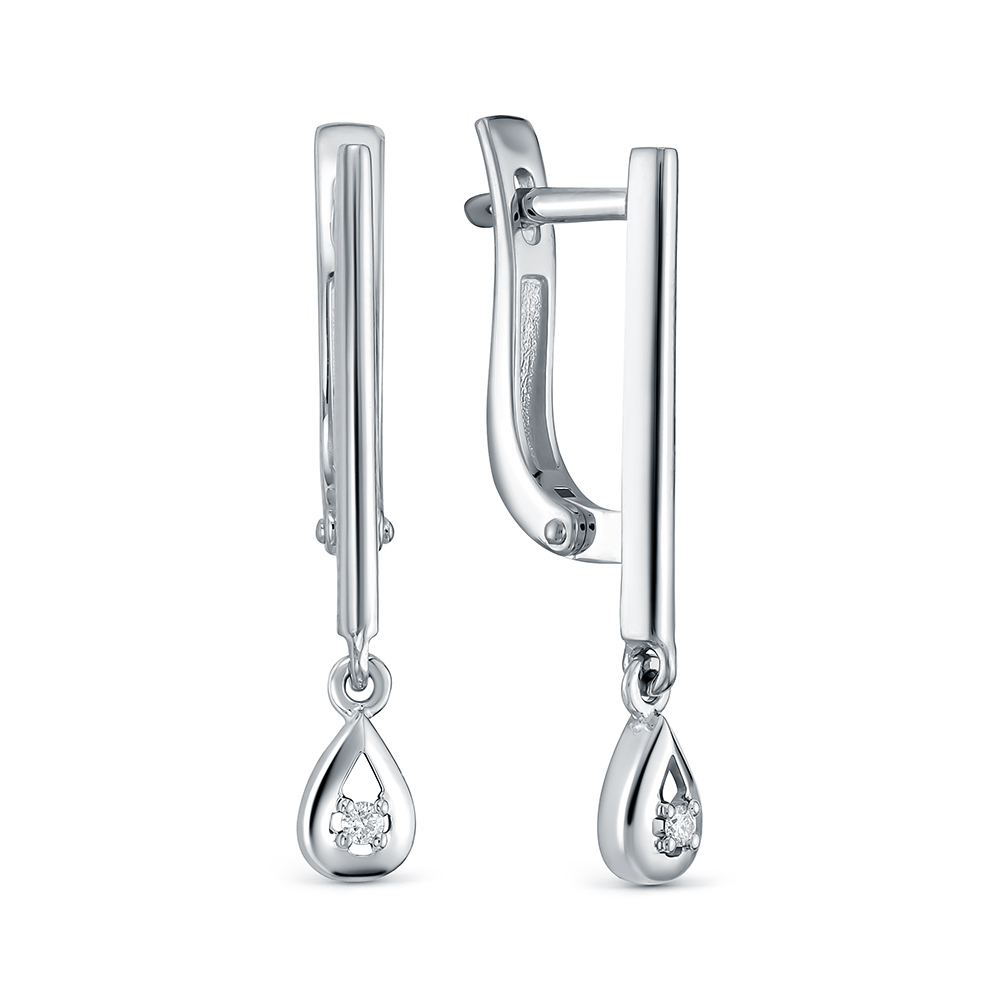 Серьги с подвесками с натуральными бриллиантами выполнены из белого золота 585 пробы. Утонченный дизайн с кристальным блеском драгоценных бриллиантов очень нежно и женственно смотрится, и изящно дополнит повседневные образы современной леди. Приобретайте серьги с комфортным английским замком по привлекательной цене в магазинах Мир Золота.