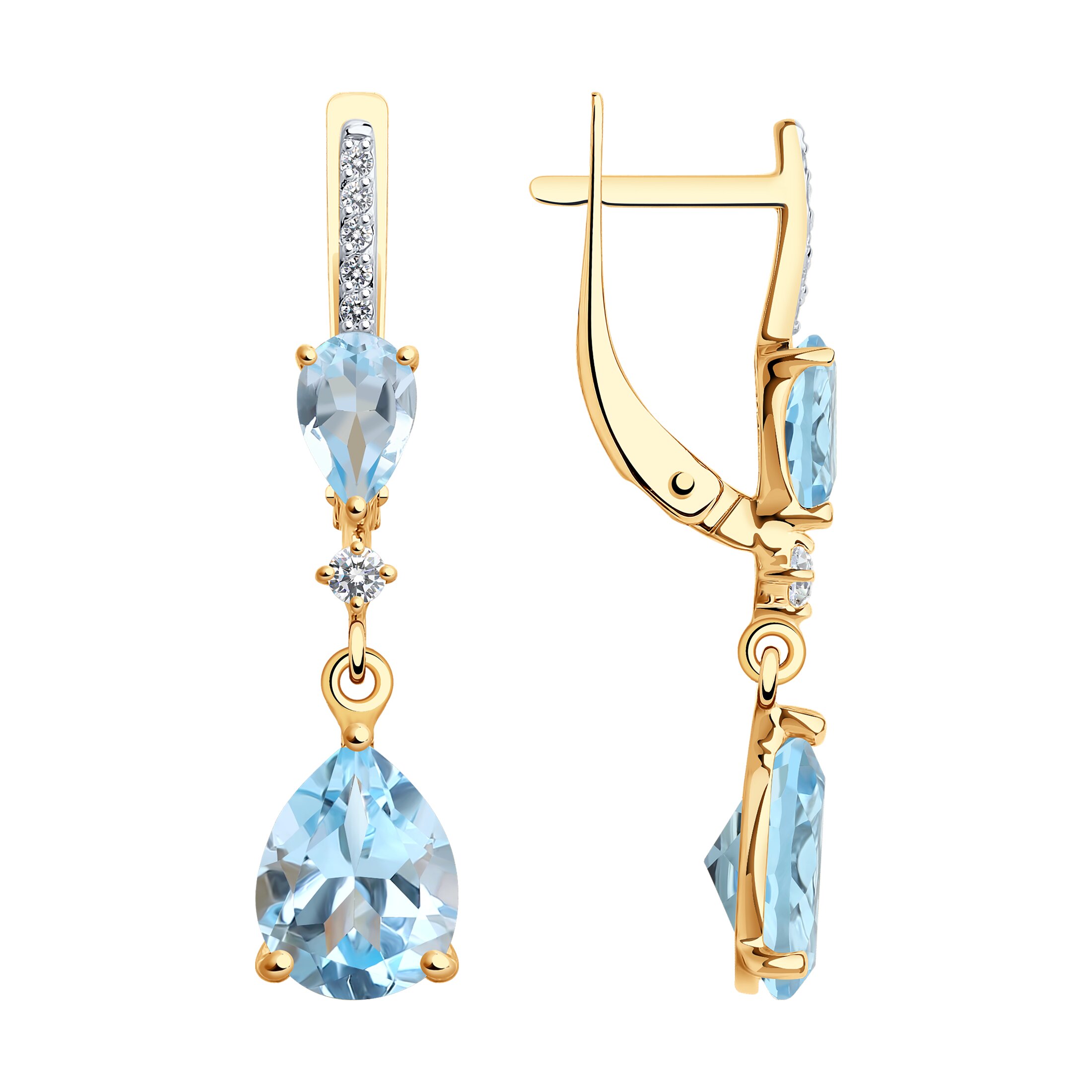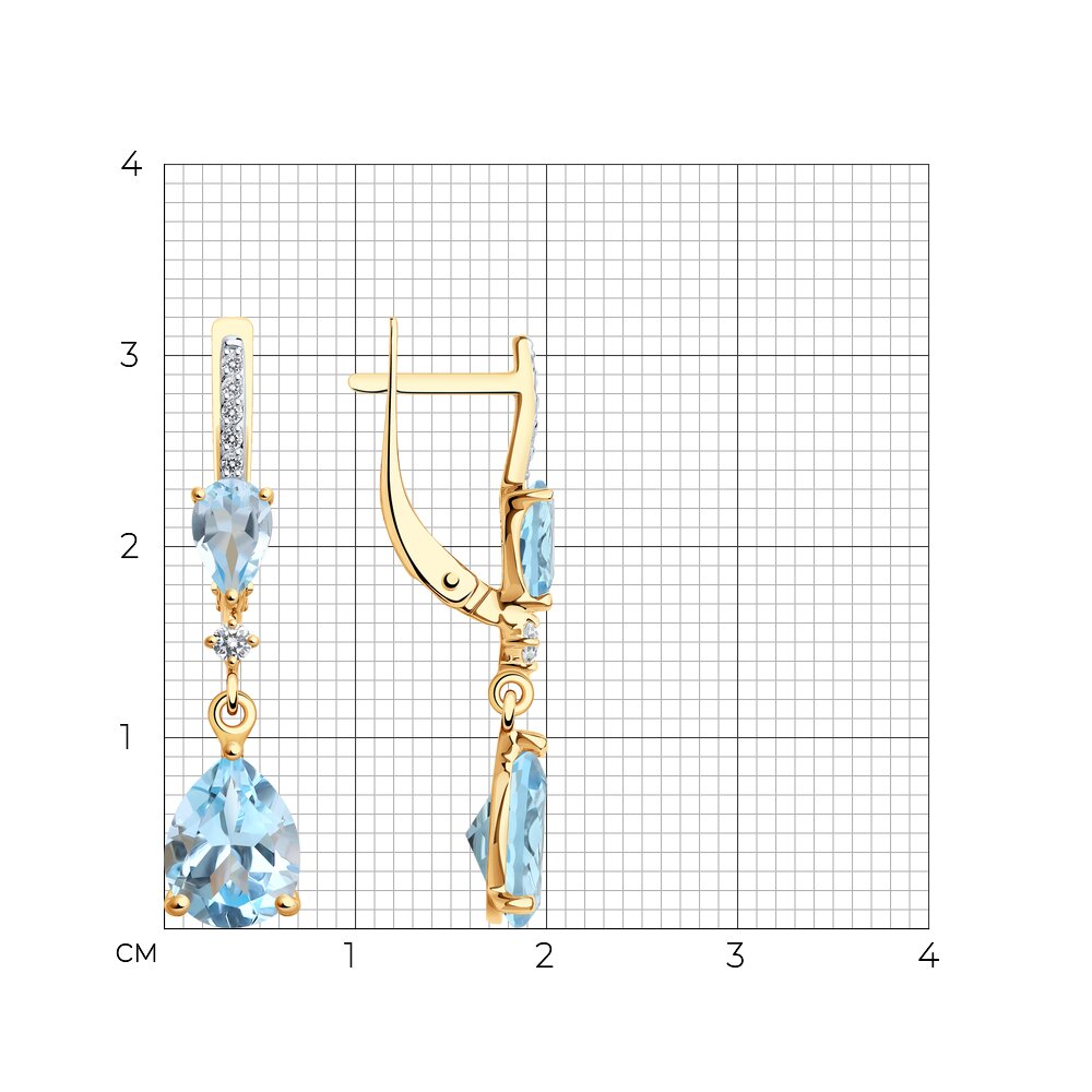 Привлекательные серьги с подвесками с натуральными голубыми топазами и фианитами выполнены из красного золота 585 пробы. Изумительные серьги с завораживающим блеском камней очаровательно смотрятся, и подчеркнут утонченный вкус и женственность владелицы. Приобретайте ювелирное украшение в подарок по выгодным ценам в магазинах Мир Золота.