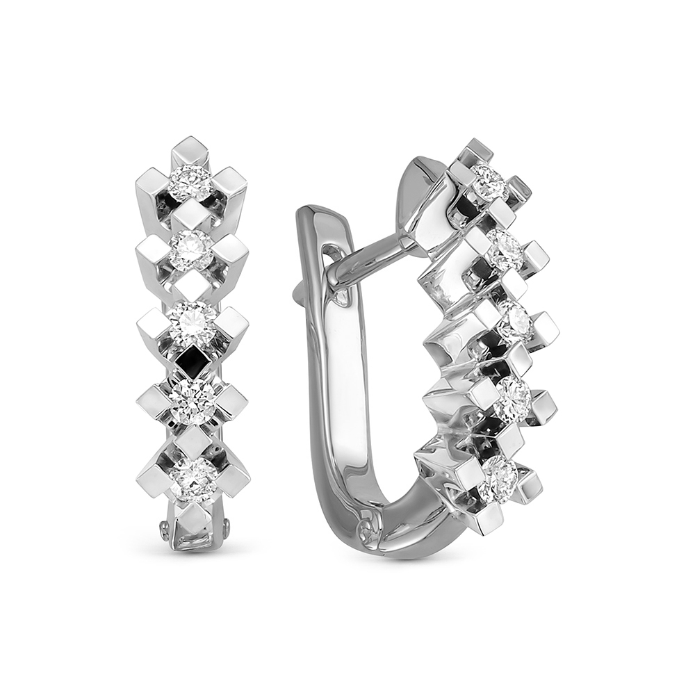 Стильные серьги современного исполнения из белого золота 585 пробы украшены дорожками великолепных бриллиантов. Эффектный дизайн с ослепительным блеском крупных драгоценных камней привлекает внимание, украшение оригинально смотрится, и отлично дополнит актуальные образы владелицы. Тип замка - английский, надежно зафиксирует украшение. Приобретайте серьги по выгодной цене в магазинах Мир Золота.