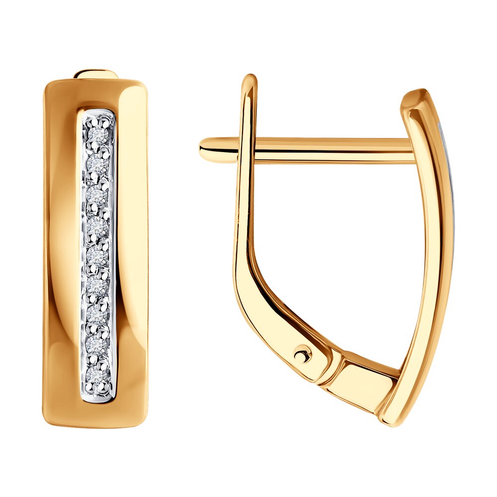 Элегантные серьги из красного золота 585 пробы украшены вставками с дорожками прозрачных бриллиантов. Привлекательное сияние нежных камней эффектно дополняет строгий лаконичный дизайн украшения. Серьги станут выразительным акцентом делового повседневного или вечернего образа, и подчеркнут безупречный вкус обладательницы. Приобретайте серьги с комфортным английским замком выгодно в магазинах Мир Золота.