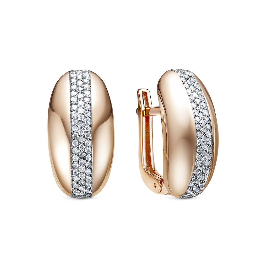 Выразительные серьги из красного золота 585 пробы, декорированные вставками с дорожками кристальных бриллиантов, выглядят солидно и достойно. Глянцевый блеск благородного золота выгодно подчеркивает изысканное сияние драгоценных камней. Приобретайте элегантное украшение с комфортным английским замком по привлекательной цене в магазинах Мир Золота.