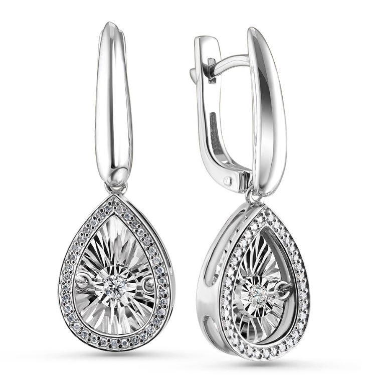 Серьги с подвесками с выразительными вставками с «танцующими» бриллиантами и алмазной гранью выполнены из белого золота 585 пробы. Драгоценные камни с подвижным креплением в окружении бриллиантовой дорожки привлекают внимание своим игривым мерцанием, благородное золото эффектно подчеркивает неповторимую красоту натуральных камней. Приобретайте великолепные серьги в подарок по выгодной цене в магазинах Мир Золота.
