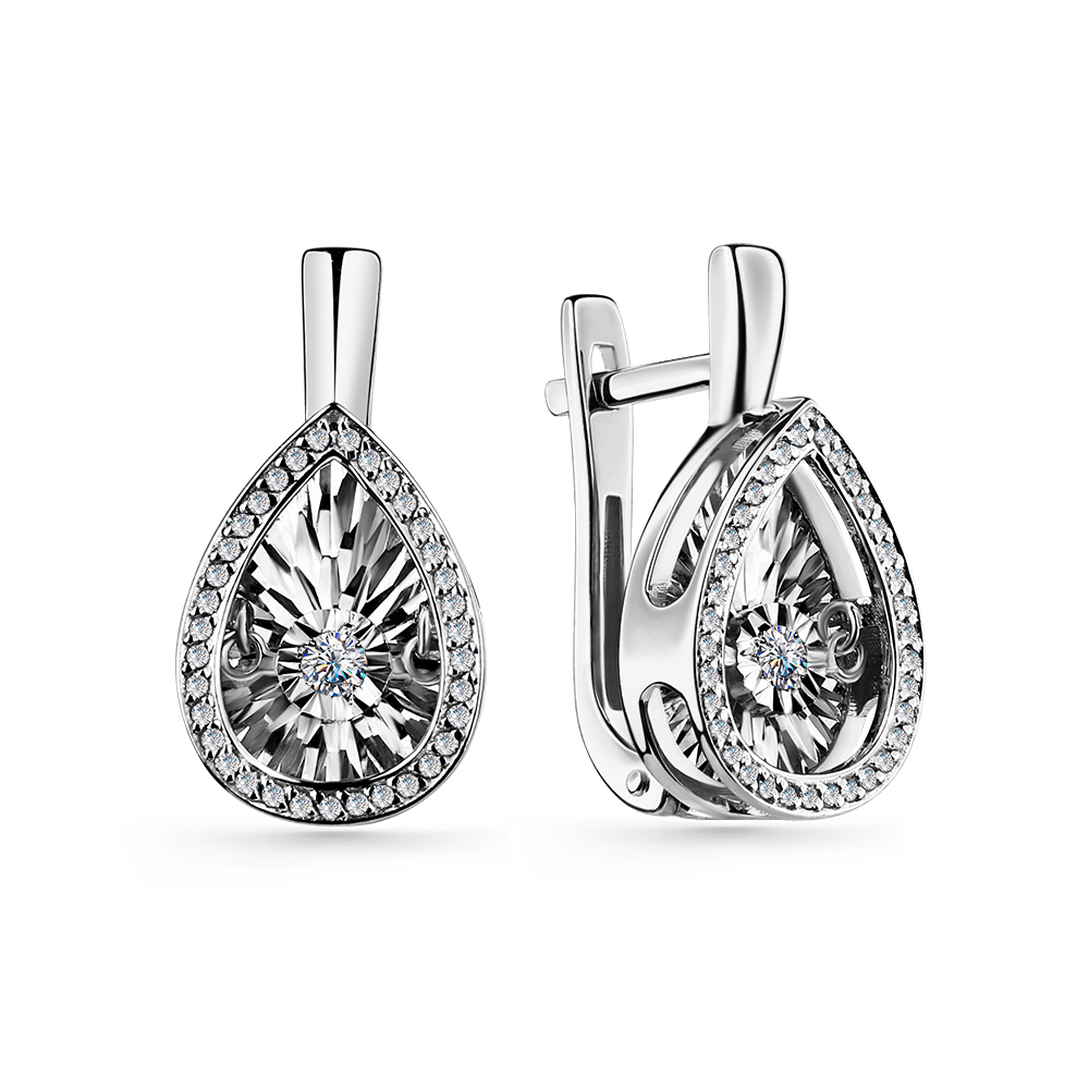 Женские серьги в форме капелек с выразительными вставками с «танцующими» бриллиантами и алмазной гранью выполнены из белого золота 585 пробы. Драгоценные камни с подвижным креплением в окружении бриллиантовой дорожки привлекают внимание своим игривым мерцанием, благородное золото выгодно подчеркивает неповторимую красоту натуральных камней. Эффектное украшение будет великолепным подарком для современных леди. Приобретайте серьги выгодно в магазинах Мир Золота.