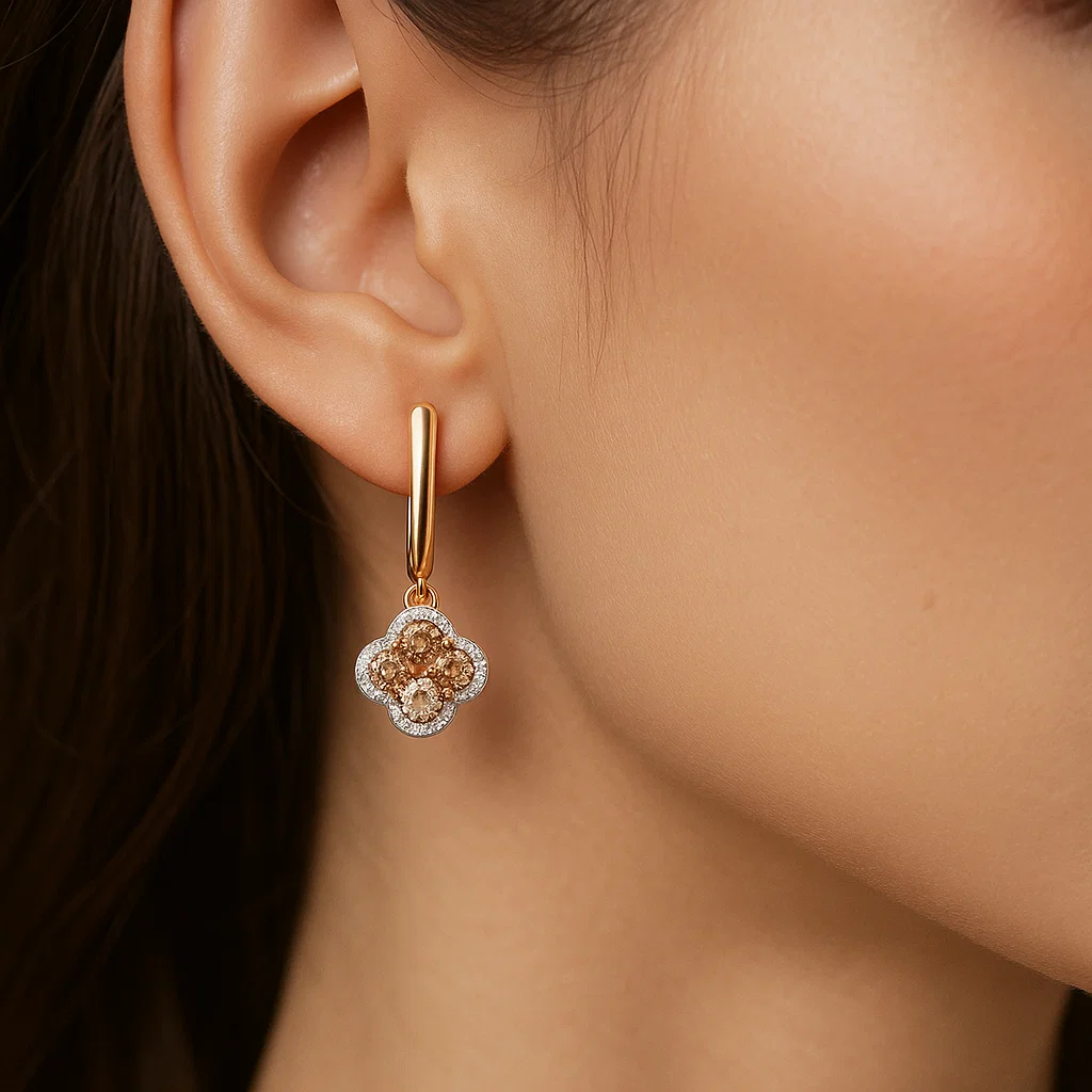 Великолепные серьги из красного золота 585 пробы с подвесками с прозрачными и коньячными бриллиантами не оставят женщину равнодушной. Трендовый флористический дизайн с роскошным сиянием драгоценных камней завораживает взгляд, и позволит создать неповторимый модный образ, подчеркнув утонченность и женственность обладательницы. Приобретайте серьги в подарок по привлекательной цене в магазинах Мир Золота.