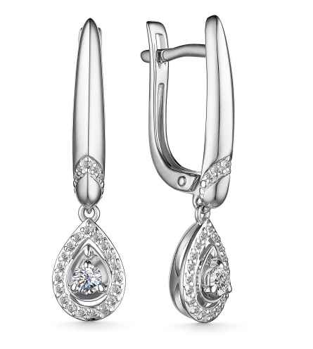Классические серьги с подвесками с прозрачными бриллиантами выполнены из белого золота 585 пробы. Элегантное и женственное украшение с завораживающим сиянием драгоценных камней в отражении холодного оттенка золота подчеркнет совершенство и изысканность образа обладательницы. Покупайте серьги с комфортным и надежным английским замком по привлекательной цене в магазинах Мир Золота.