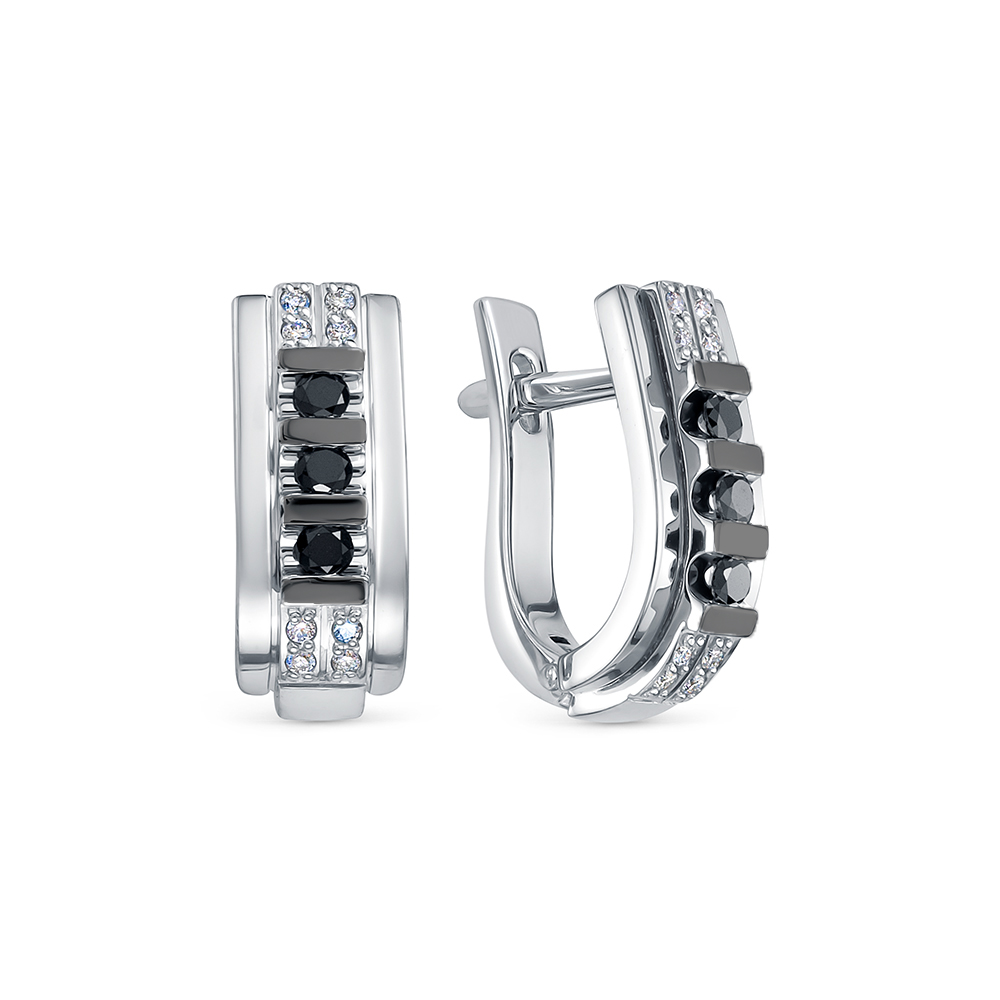 Стильные серьги с черными и прозрачными бриллиантами выполнены из белого золота 585 пробы в современном дизайне. Эффектное сочетание сияющей прозрачности и завораживающей магии черных драгоценных камней в отражении благородного золота привлекает внимание, и сделает современный образ владелицы более ярким и выразительным. Тип замка - английский. Приобретайте ювелирное украшение по выгодным ценам в магазинах Мир Золота.