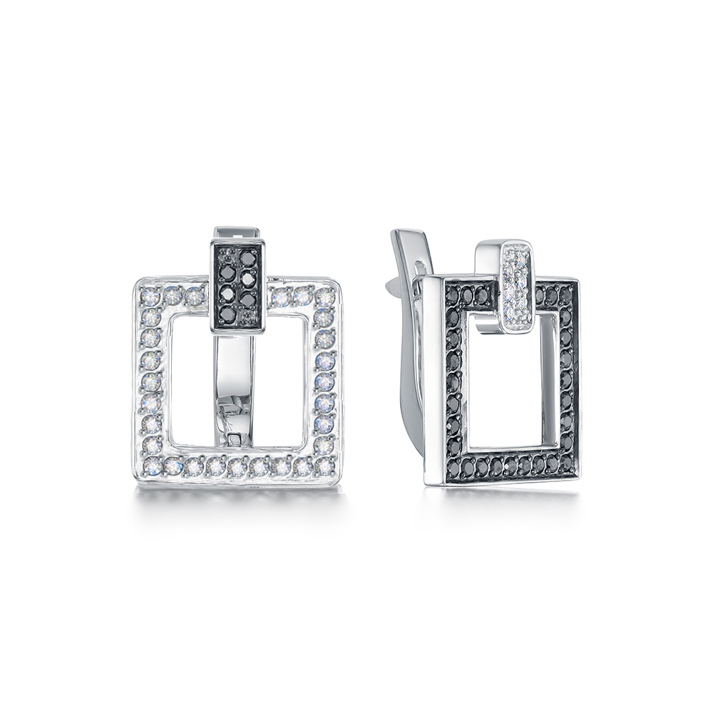 Стильные серьги из белого золота 585 пробы декорированы дорожками прозрачных и черных бриллиантов. Современный ассиметричный дизайн с четкими геометричными формами и притягательным блеском драгоценных камней подчеркнет индивидуальность владелицы, и сделает женский образ более ярким и эффектным. Приобретайте актуальное украшение выгодно в магазинах Мир Золота.