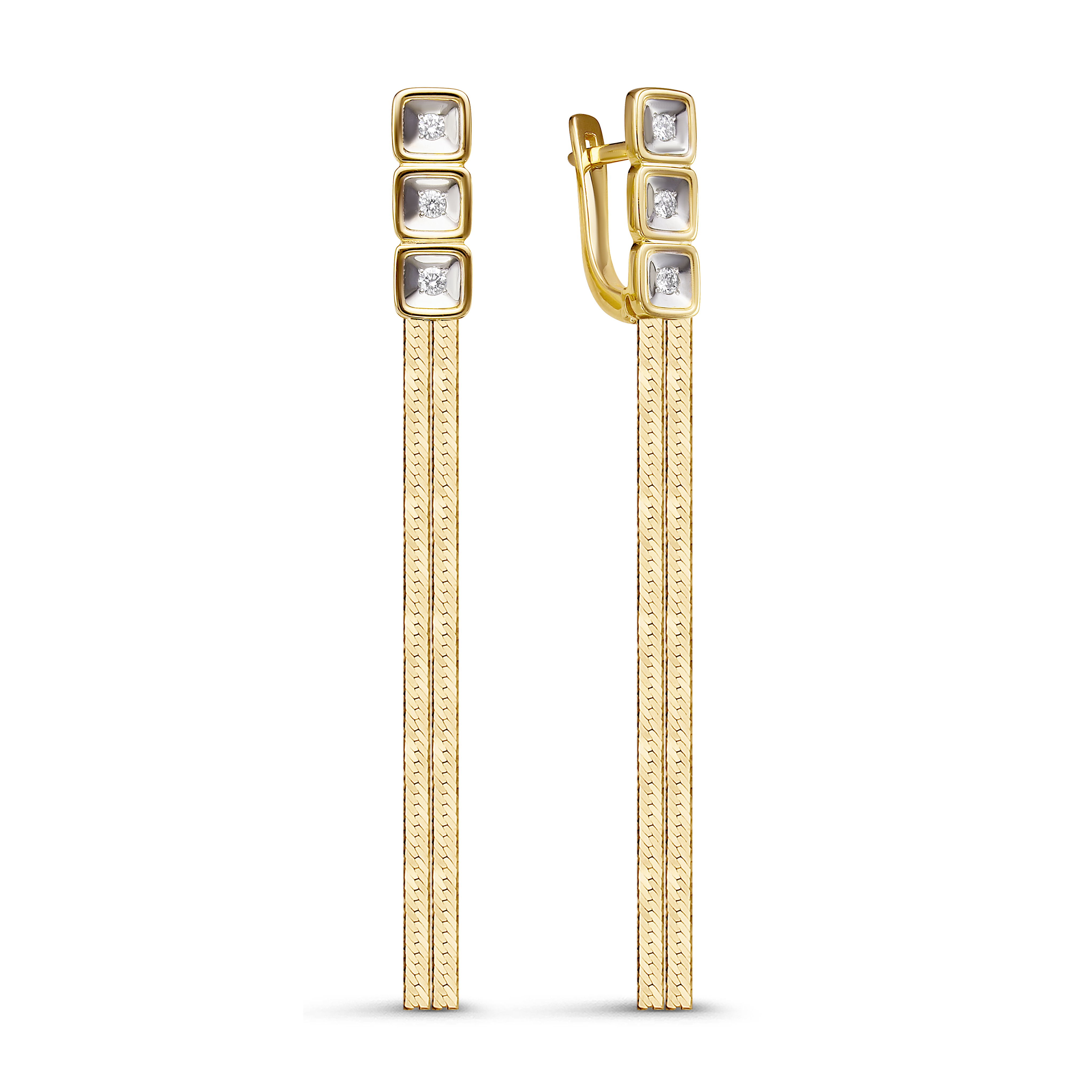 Длинные серьги из желтого золота 585 пробы, декорированные шестью бриллиантами, сделают современный образ владелицы более ярким и стильным. Закрепка бриллиантов в белом золоте придает камням объем и подчеркивает их неповторимую природную красоту. Тип замка - английский, самый надежный и удобный. Приобретайте серьги по выгодной цене в магазинах Мир Золота.