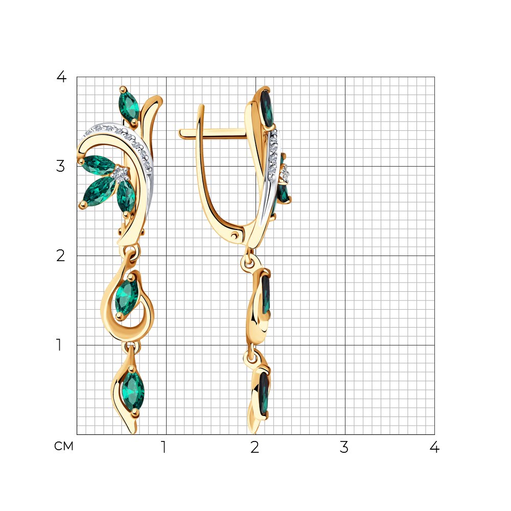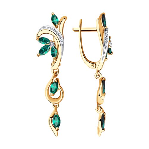 Изумительные серьги с подвесками с натуральными изумрудами и бриллиантами выполнены из красного золота 585 пробы. Чарующие изумруды утонченной формы огранки завораживают взгляд, изящные линии золота с фигурными дорожками кристальных бриллиантов подчеркивают их пленительное сияние. Великолепные серьги станут эффектным завершением вечернего или праздничного образа. Покупайте серьги в подарок по выгодной цене в магазинах Мир Золота.