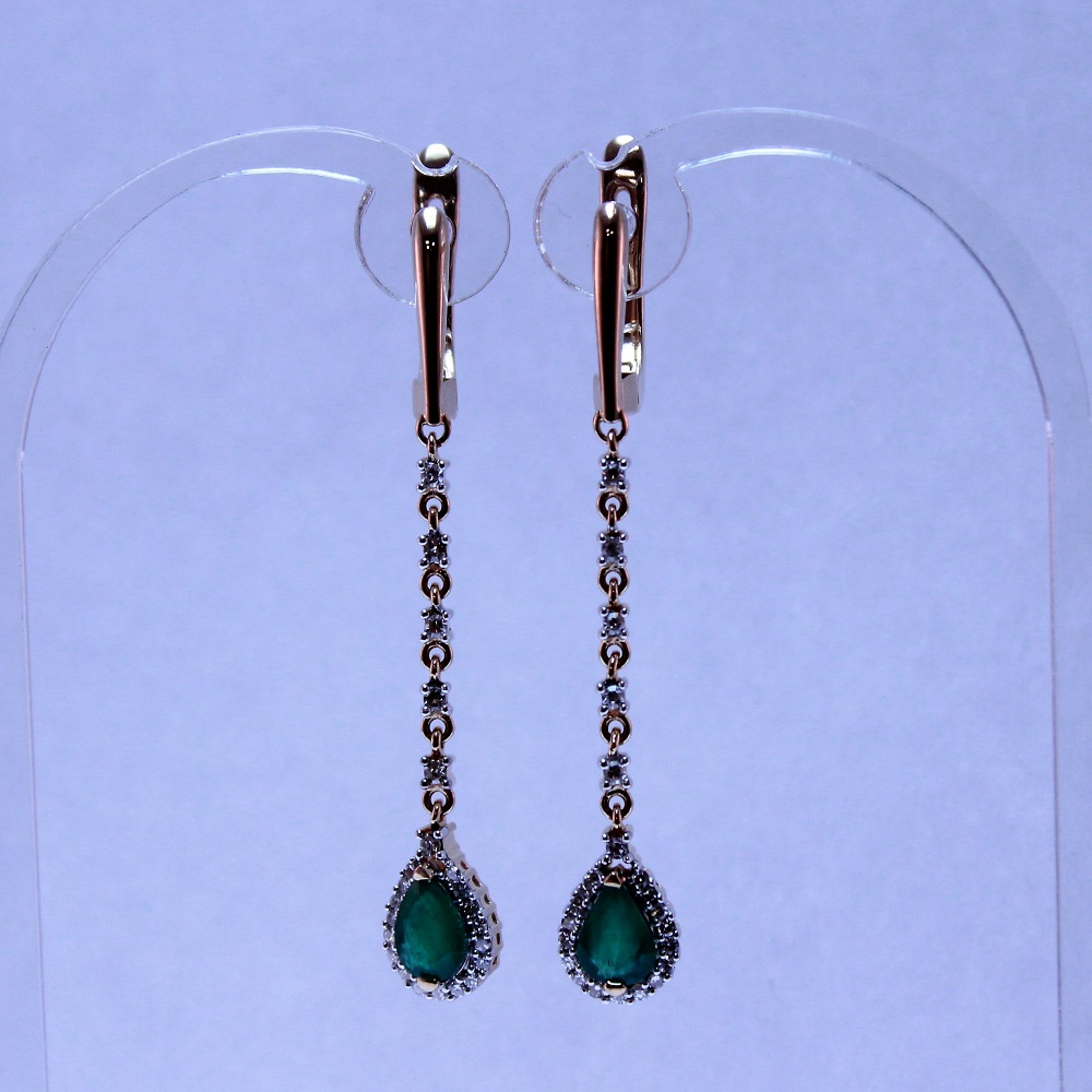 Длинные серьги с подвесками с великолепными изумрудами и бриллиантами выполнены из красного золота 585 пробы. Утонченные серьги с завораживающим блеском драгоценных камней очень женственно и элегантно смотрятся, и станут изысканным акцентом вечернего образа. Приобретайте ювелирное украшение по привлекательной цене в магазинах Мир Золота.