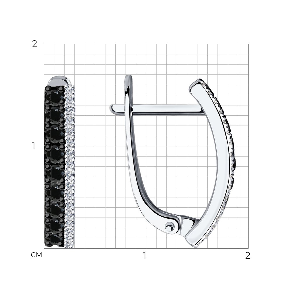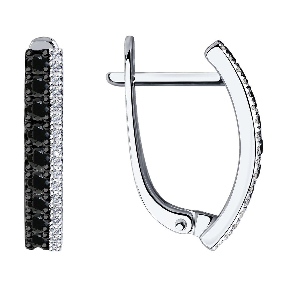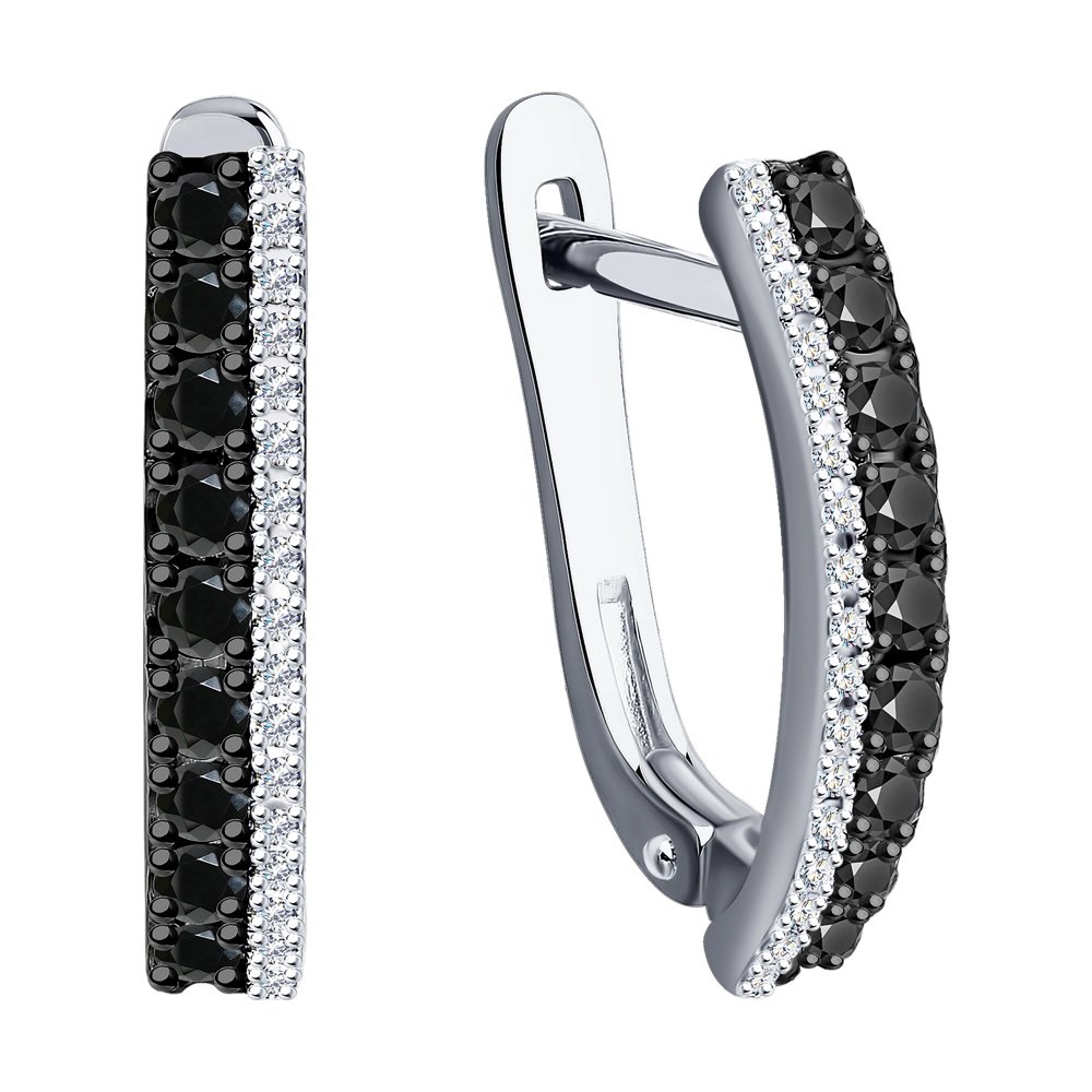 Утонченные серьги из белого золота 585 пробы с дорожками прозрачных и черных бриллиантов станут изысканным дополнением классического или современного образа. Яркое украшение с роскошным блеском драгоценных камней очень стильно и элегантно смотрится, и не оставит женщину равнодушной. Тип замка: английский. Приобретайте серьги по выгодной цене в магазинах Мир Золота.