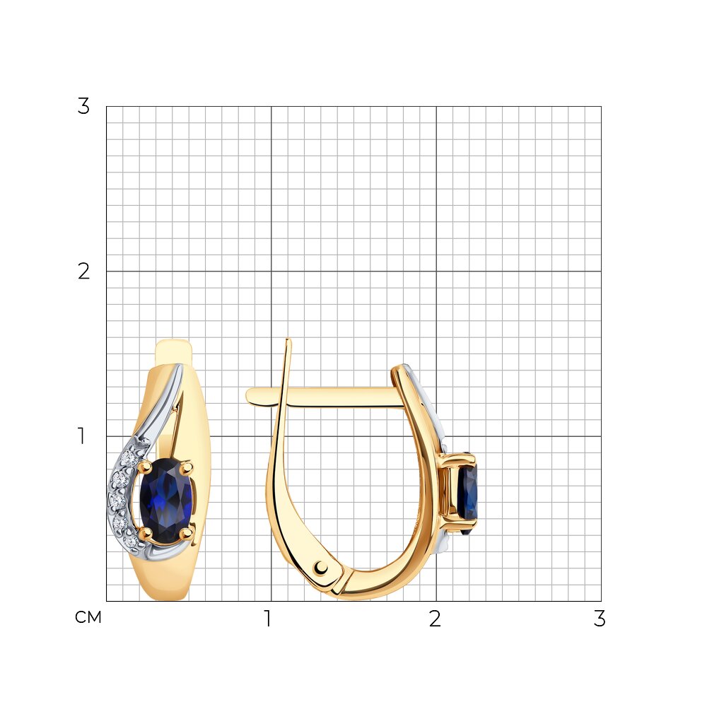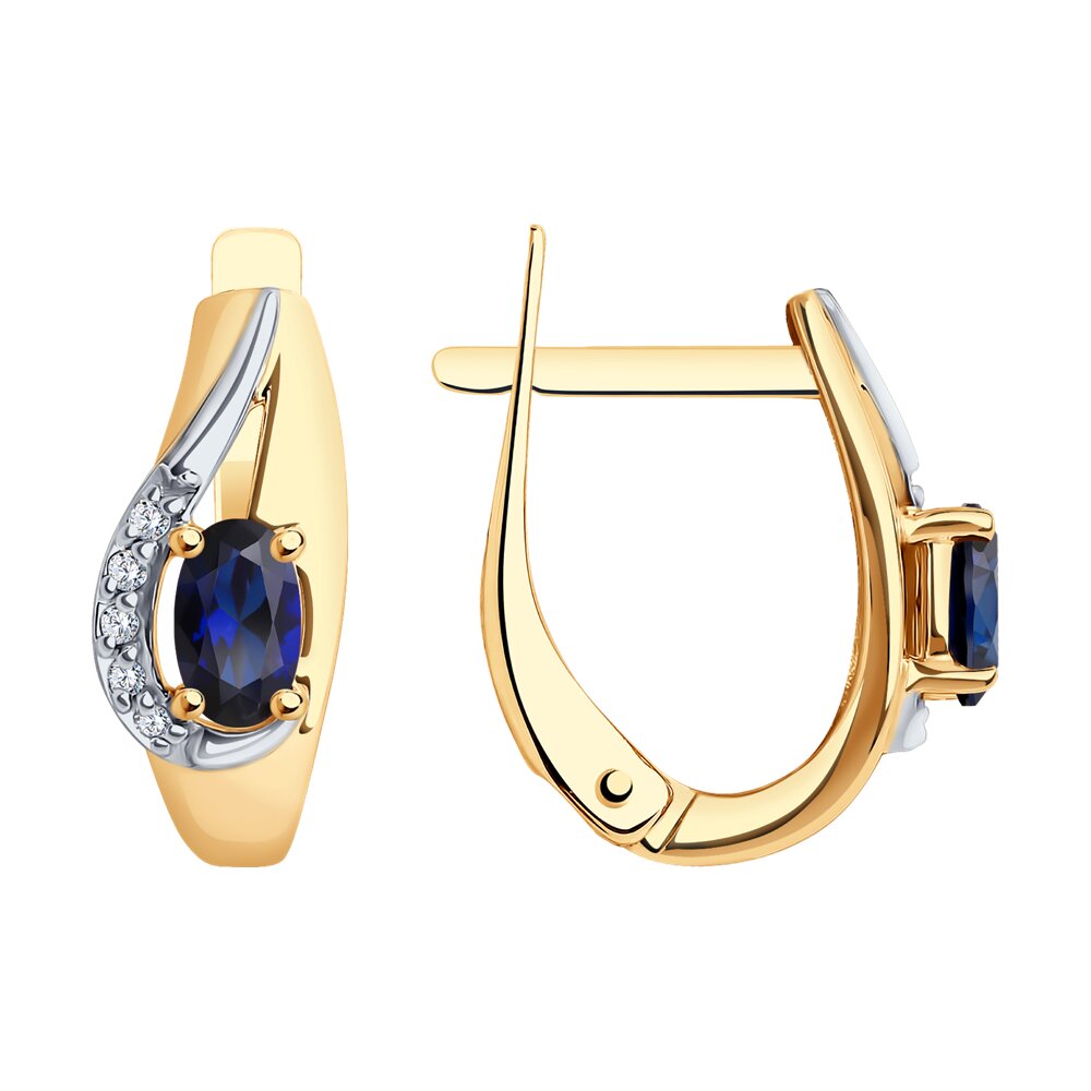 Серьги из красного золота 585 пробы с синтетическими корундами и фигурными дорожками с кристальными бриллиантами. Украшение современного дизайна с ярким акцентом синих корундов подчеркнет красоту и женственность владелицы, и будет особенно привлекательно смотреться в комплекте с кольцом. Приобретайте серьги с комфортным и надежным английским замком по выгодным ценам в магазинах Мир Золота.
