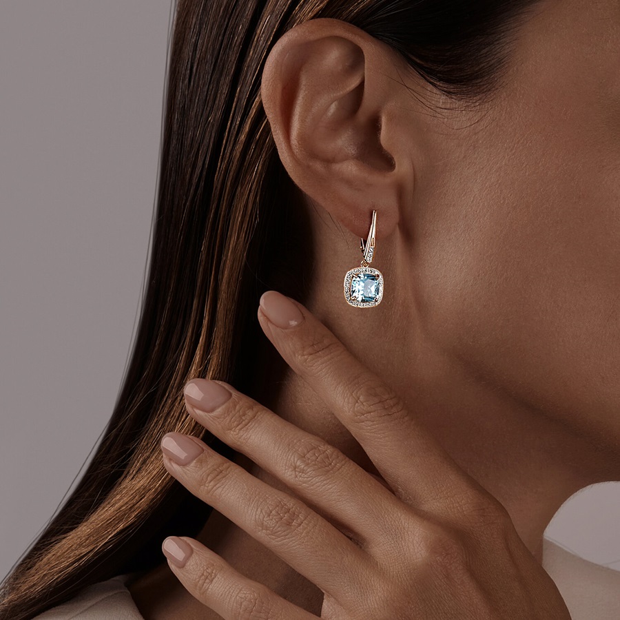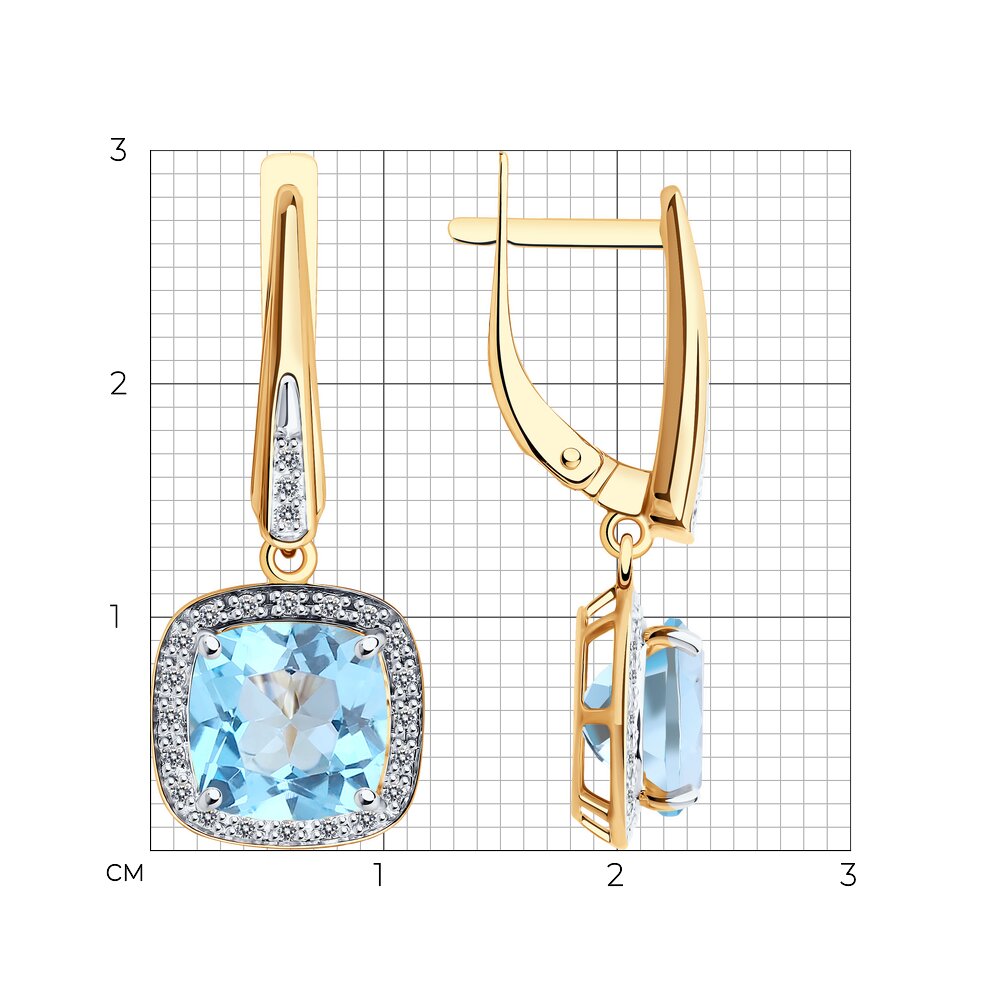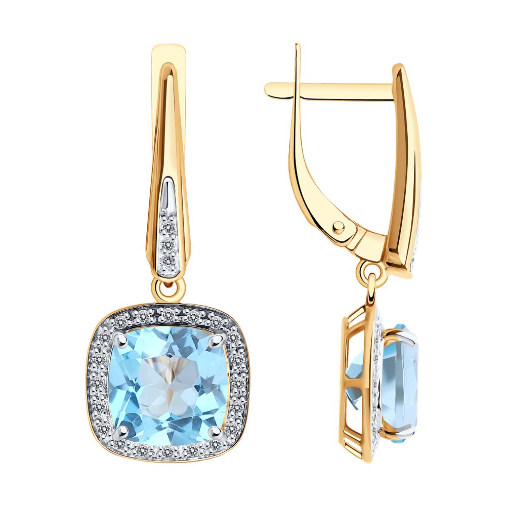 Серьги с подвесками из красного золота 585 пробы с превосходными голубыми топазами привлекательной формы огранки в окружении сияющих бриллиантов не оставят женщину равнодушной. Элегантное украшение с неповторимым блеском камней подчеркнет чувственность и женственность владелицы, и отлично подойдет для вечернего образа. Тип замка - английский. Приобретайте серьги в подарок по выгодной цене в магазинах Мир Золота.