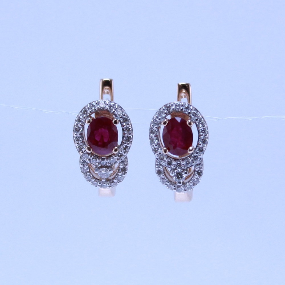 Серьги с великолепными рубинами в окружении сияющих бриллиантов выполнены из красного золота 585 пробы. Блистательное украшение с драгоценными камнями будет прекрасно смотреться в вечернем образе, и подчеркнет безупречный вкус обладательницы. Практичный английский замок комфортен в использовании. Приобретайте ювелирное украшение по выгодной цене в магазинах Мир Золота.