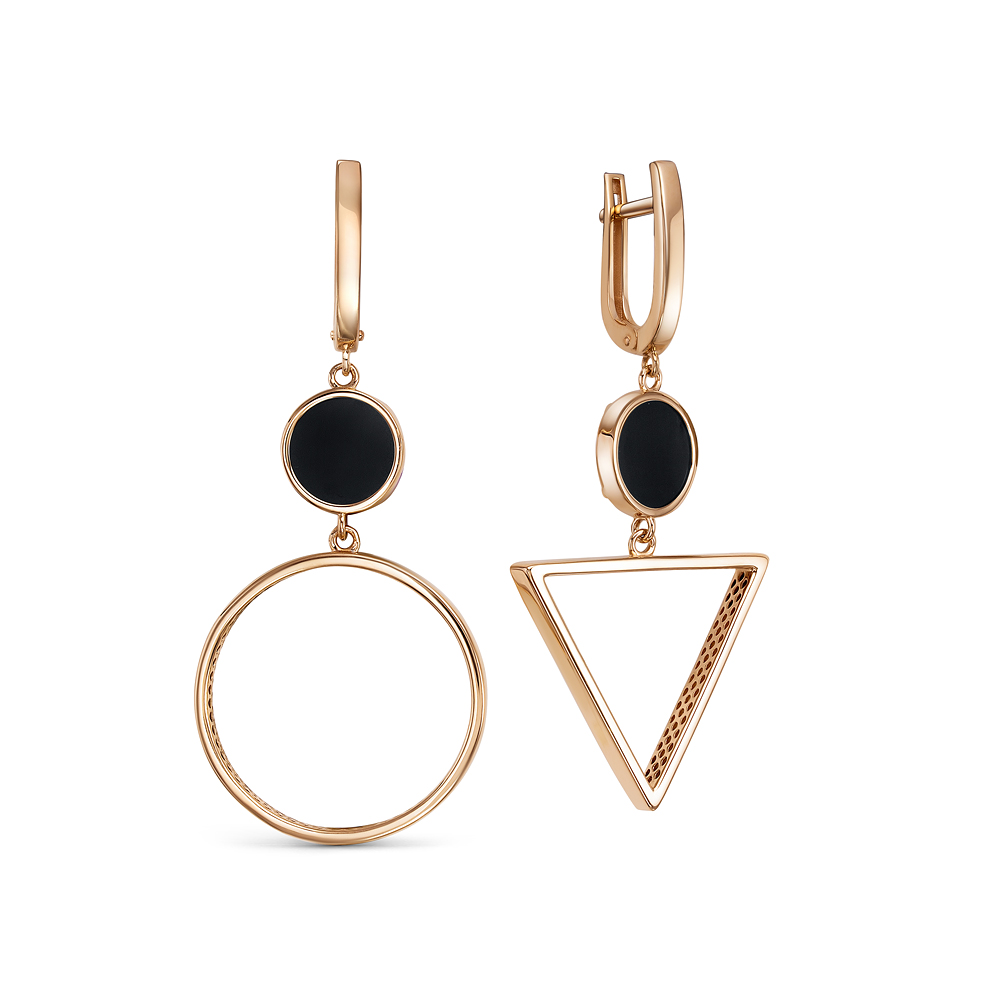 Серьги с подвесками из красного золота 585 пробы с черным ониксом смотрятся стильно и современно. Лаконичный дизайн с правильными геометрическими формами и выразительным блеском круглых черных камней отлично впишется в динамичные трендовые образы и подчеркнет индивидуальность стиля владелицы. Тип замка - английский. Приобретайте оригинальные серьги по выгодной цене в магазинах Мир Золота.