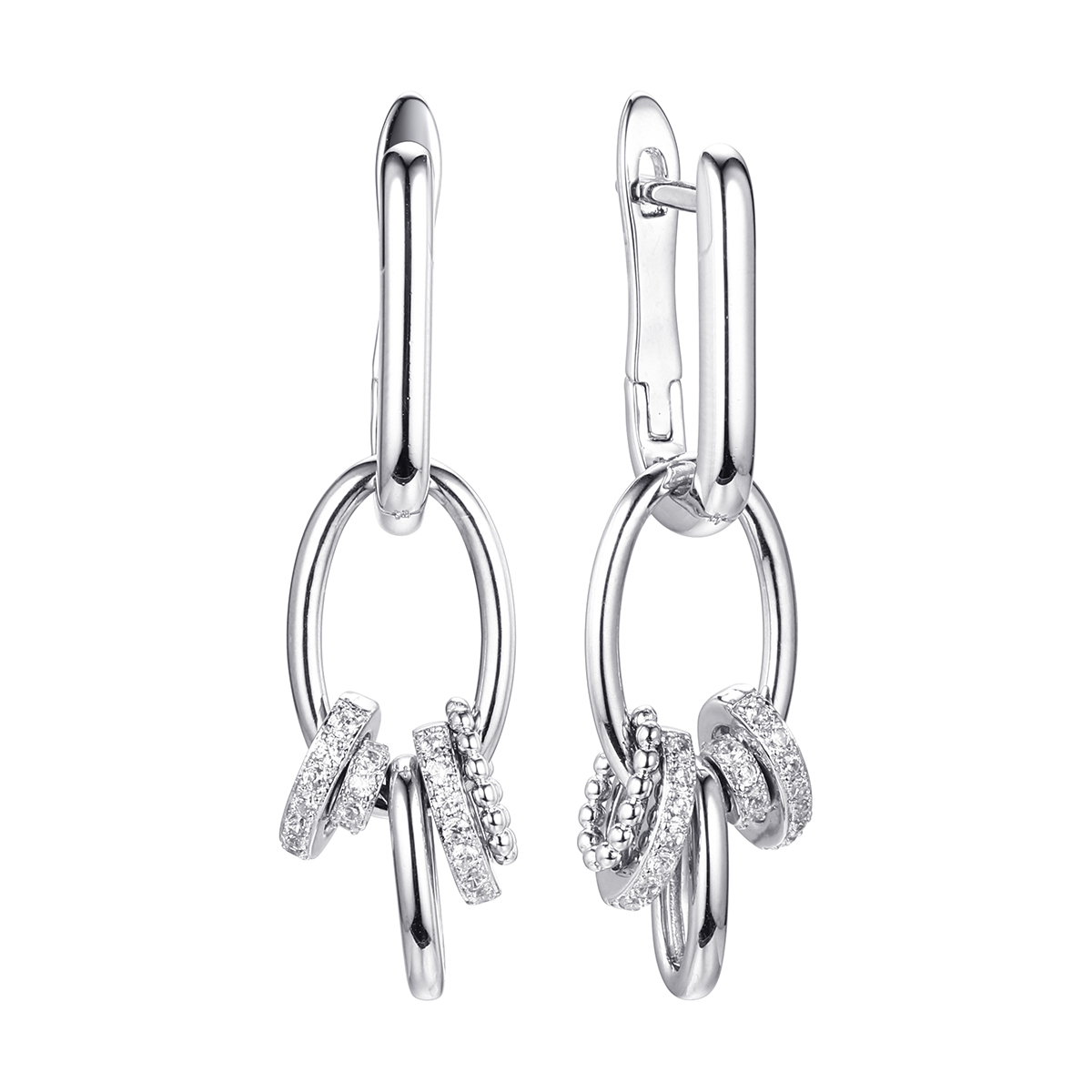 Оригинальные серьги для тех, кто любит моду. Эффектные серебряные серьги с подвесками, декорированные прозрачными фианитами. Украшение покрыто металлом платиновой группы родием, что препятствует потемнению серебра и придает яркий искрящийся блеск. Купите женские серьги с подвесками в магазинах Мир Золота.