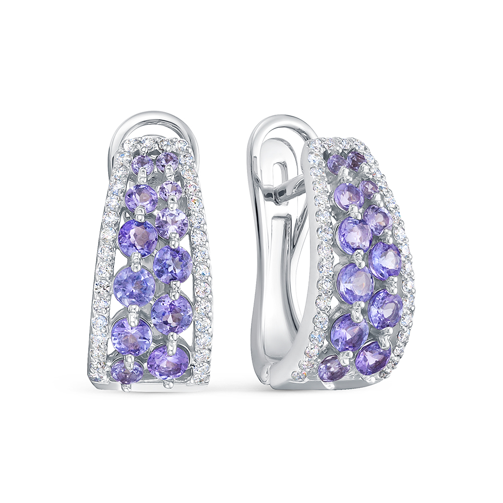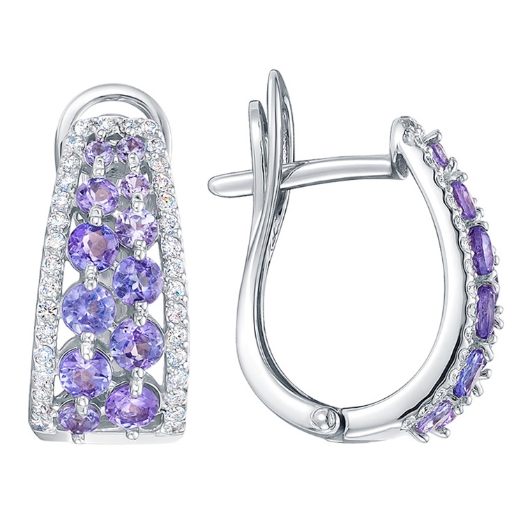 Великолепные серьги из белого золота 585 пробы с дорожками прекрасных танзанитов и сияющих бриллиантов покоряют с первого взгляда. Лавандовый оттенок танзанитов эффектно смотрится на фоне холодного блеска золота, кристальные бриллианты выгодно подчеркивают их красоту и удивительное сияние. Приобретайте изысканное украшение в подарок по привлекательной цене в магазинах Мир Золота.