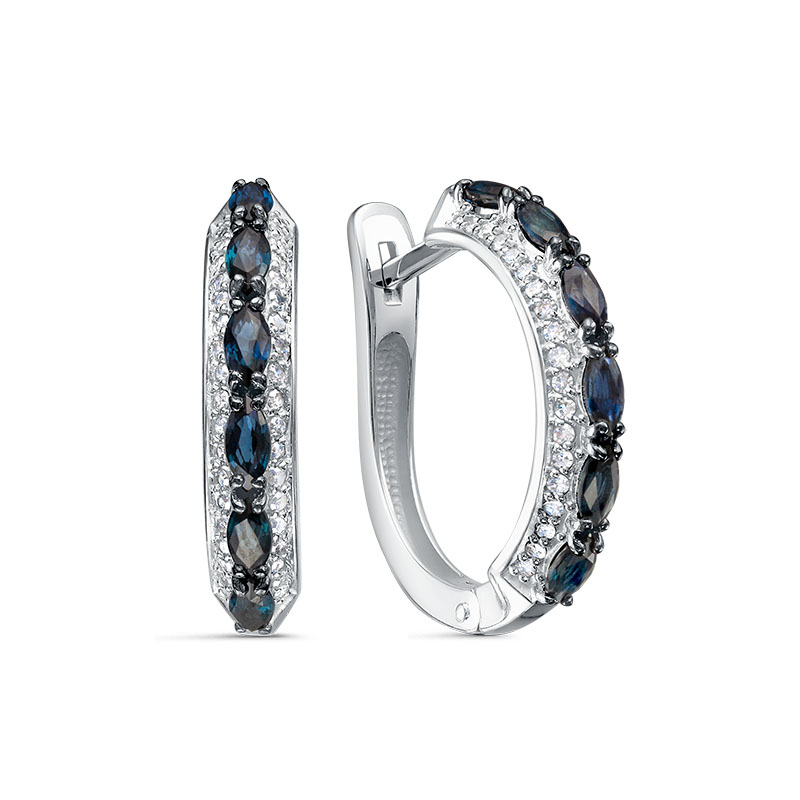 Элегантные серьги из белого золота 585 робы с дорожками натуральных сапфиров и сияющих бриллиантов подчеркнут женственность и изысканный вкус обладательницы. Притягательные сапфиры утонченной формы огранки в кристальном сиянии драгоценных бриллиантов завораживают взгляд, и наполнят женский образ неповторимым шармом и очарованием. Приобретайте ювелирное украшение в подарок по выгодной цене в магазинах Мир Золота.