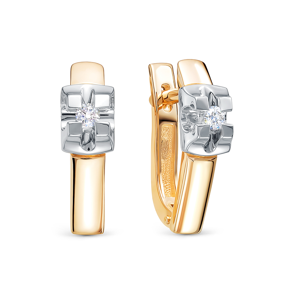 Серьги из красного золота 585 пробы декорированы выразительными вставками из белого золота с прозрачными бриллиантами. Драгоценный блеск золота выгодно подчеркивает изумительное сияние природных камней. Украшение смотрится стильно и современно, и станет заметным акцентом повседневного образа. Приобретайте серьги по выгодной цене в магазинах Мир Золота.