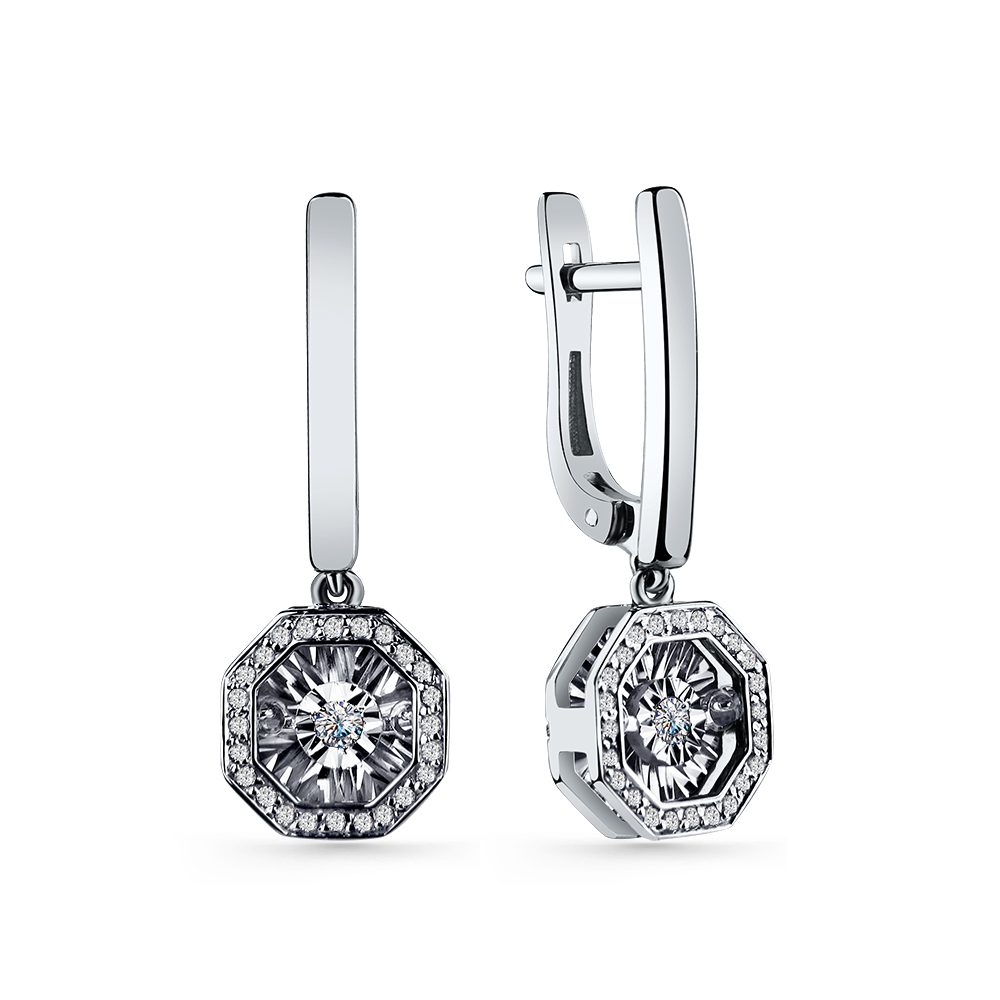 Серьги из белого золота 585 пробы с подвесками с сияющими бриллиантами изысканно подчеркнут красоту и женственность владелицы. Украшение с главным акцентом «танцующих» бриллиантов в окружении бриллиантовых дорожек станет безупречным завершением элегантного образа, и наполнит его неповторимым шармом и очарованием. Приобретайте ювелирное украшение в подарок по выгодным ценам в магазинах Мир Золота.