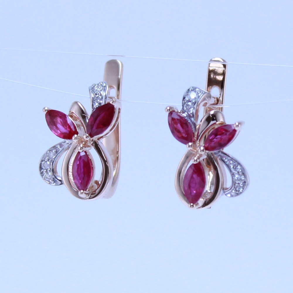 Серьги изящного ювелирного дизайна из красного золота 585 пробы декорированы натуральными рубинами утонченной формы огранки и прозрачными бриллиантами. Серьги с ярким акцентом рубинов, подчеркнутых кристальным блеском драгоценных бриллиантов, очаровывают с первого взгляда, и станут изысканной деталью женственного образа. Приобретайте украшение в подарок по выгодной цене в магазинах Мир Золота.