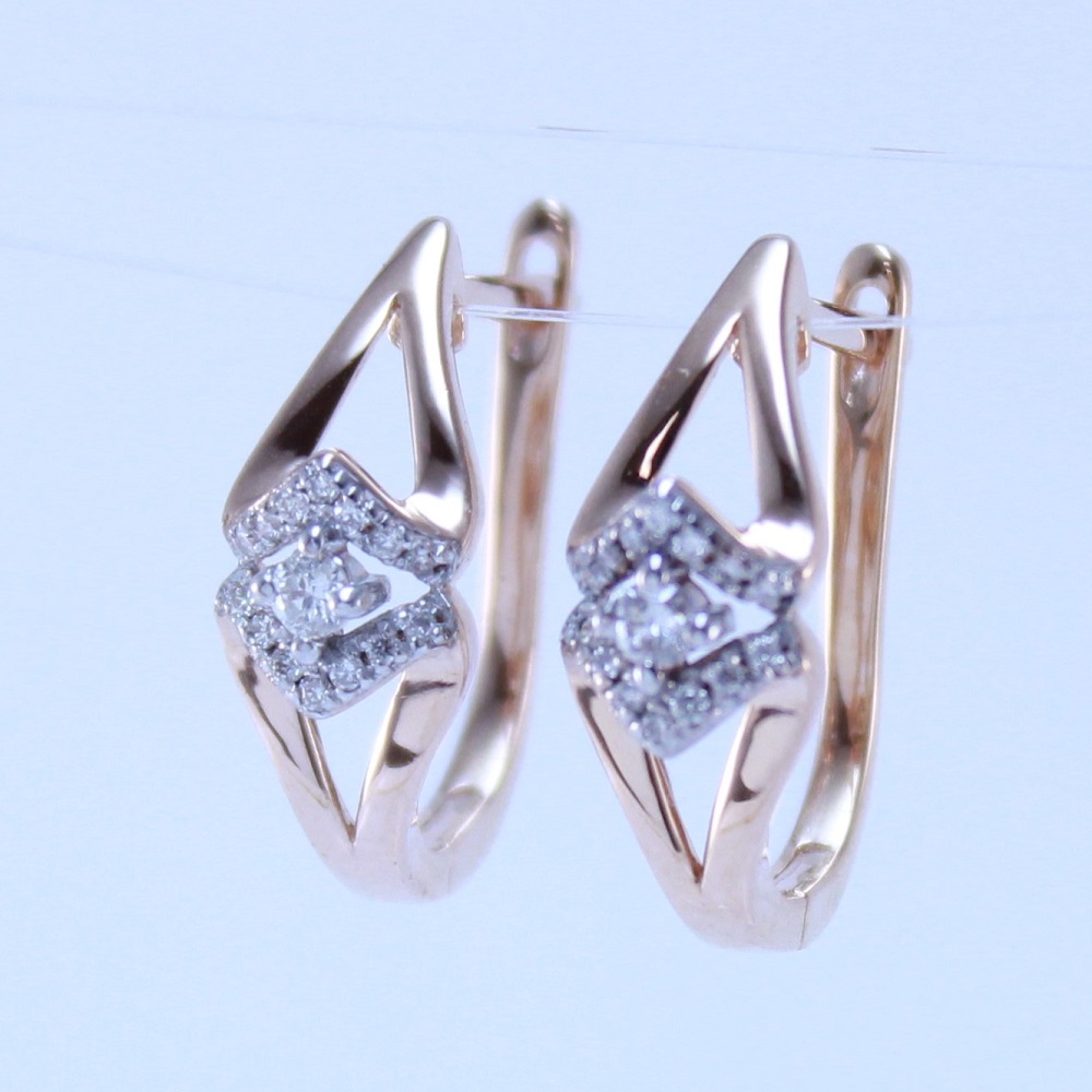 Стильные серьги из красного золота 585 пробы с драгоценными бриллиантами элегантно дополнят современные образы владелицы. Благородное золото выгодно подчеркивает неповторимую природную красоту и изысканный блеск драгоценных камней. Тип замка - английский, комфортный и надежный в использовании. Приобретайте серьги по привлекательной цене в магазинах Мир Золота.