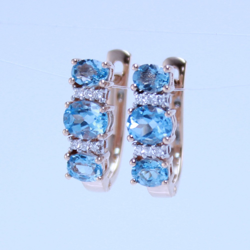 Серьги из красного золота 585 пробы с прекрасными голубыми топазами и драгоценными бриллиантами будут отличным выбором для повседневного и вечернего образа. Неповторимый изысканный блеск натуральных камней завораживает взгляд, и подчеркнет истинную женственность и очарование владелицы. Приобретайте серьги с комфортным английским замком по выгодной цене в магазинах Мир Золота.