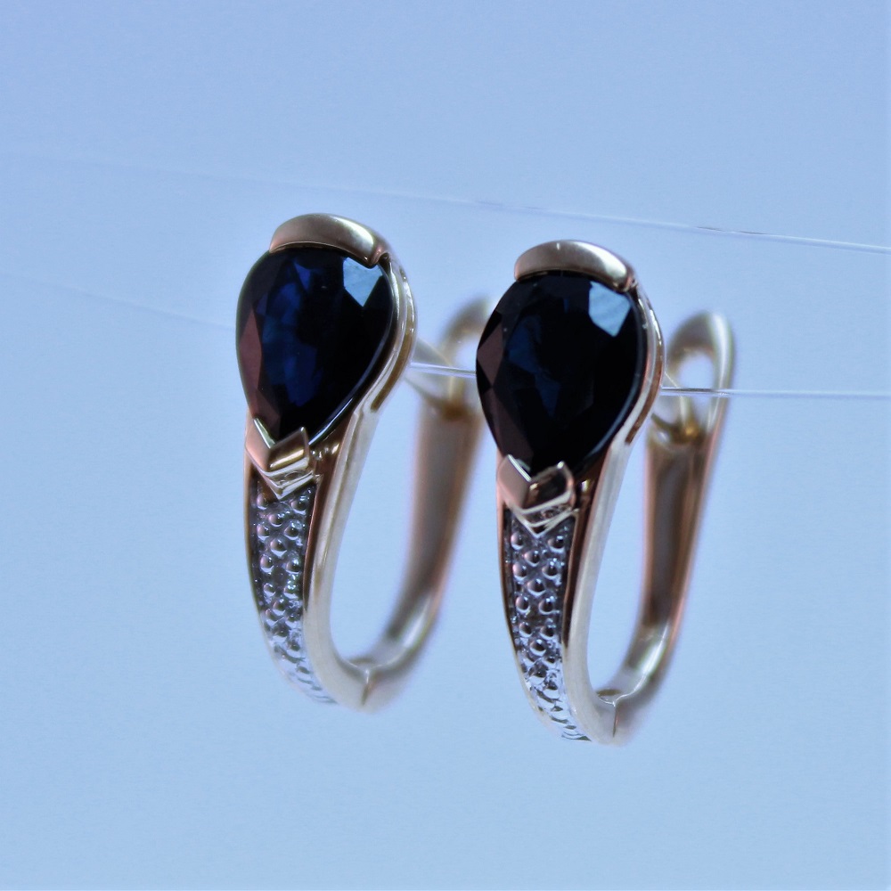 Серьги из красного золота 585 пробы декорированы синими сапфирами грушевидной формы огранки и миниатюрными бриллиантами. Сапфиры глубокого синего оттенка, подчеркнутые блеском благородного золота, завораживают взгляд, и станут изысканным акцентом современного образа. Приобретайте ювелирное украшение в подарок по привлекательной цене в магазинах Мир Золота.
