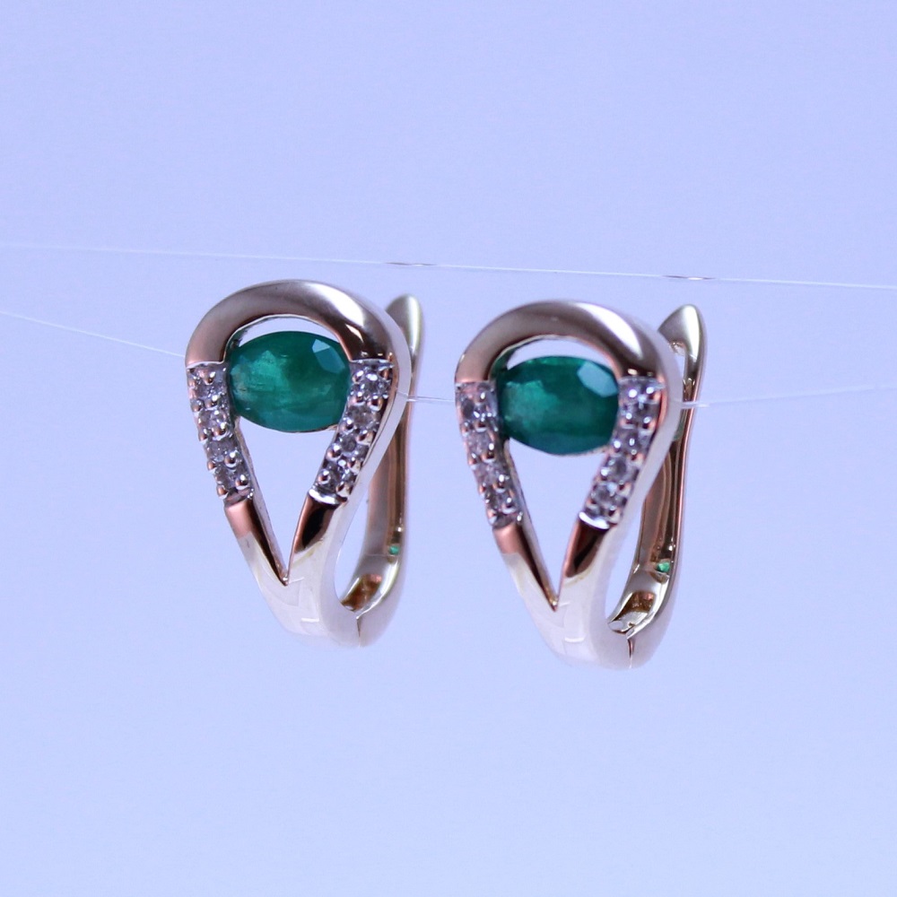 Стильные серьги с натуральными изумрудами и бриллиантами выполнены в актуальном ювелирном дизайне из красного золота 585 пробы. Яркое украшение с притягательным блеском драгоценных камней великолепно смотрится, и будет отличным выбором для современных образов. Приобретайте серьги с практичным английским замком по выгодным ценам в магазинах Мир Золота.