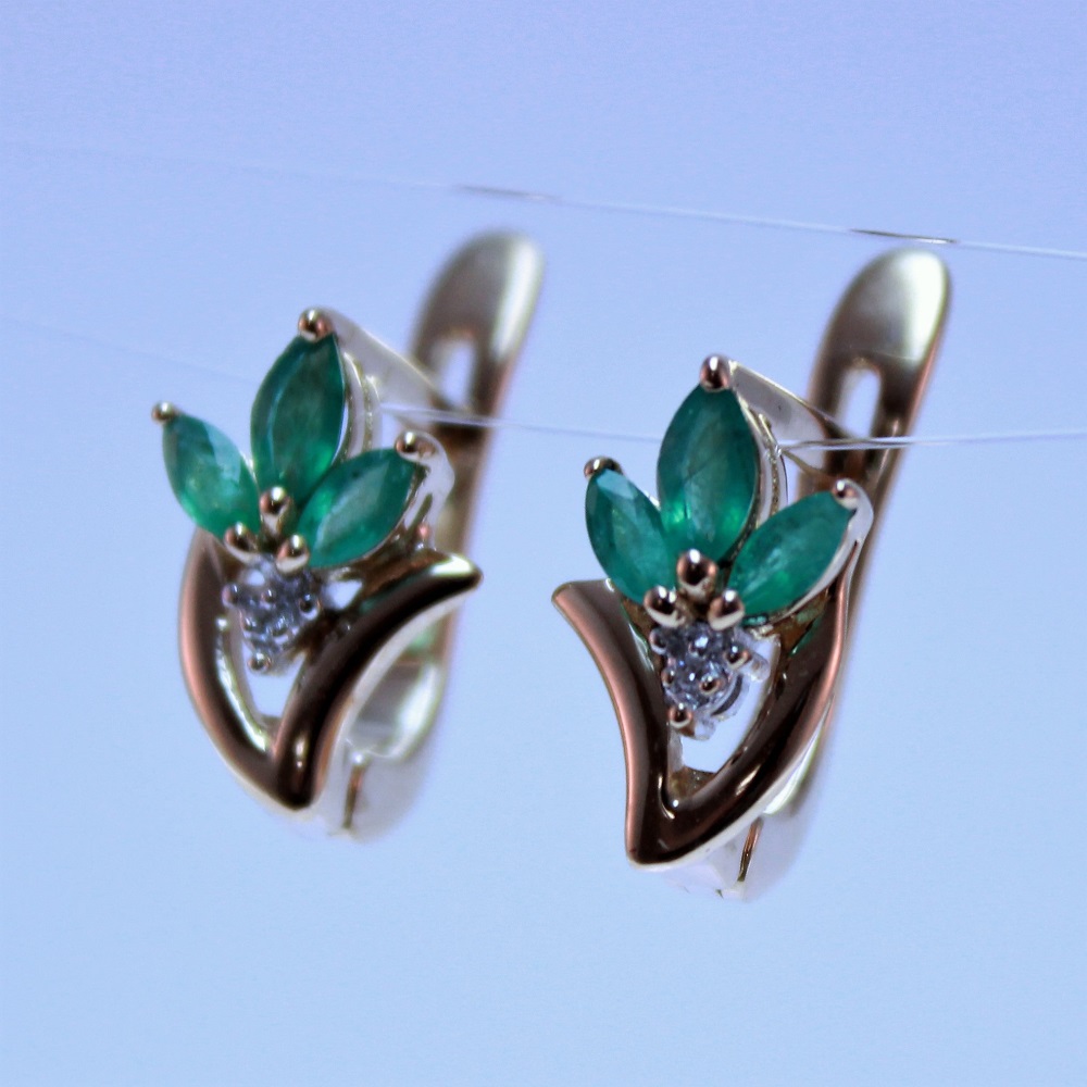 Очаровательные серьги с изумрудами и бриллиантами выполнены из красного золота 585 пробы в привлекательном ювелирном дизайне. Серьги с изумительным блеском драгоценных камней изящно смотрятся на ушке, и будут идеальным дополнением нежного женственного образа. Приобретайте ювелирное украшение для прекрасного подарка по выгодной цене в магазинах Мир Золота.