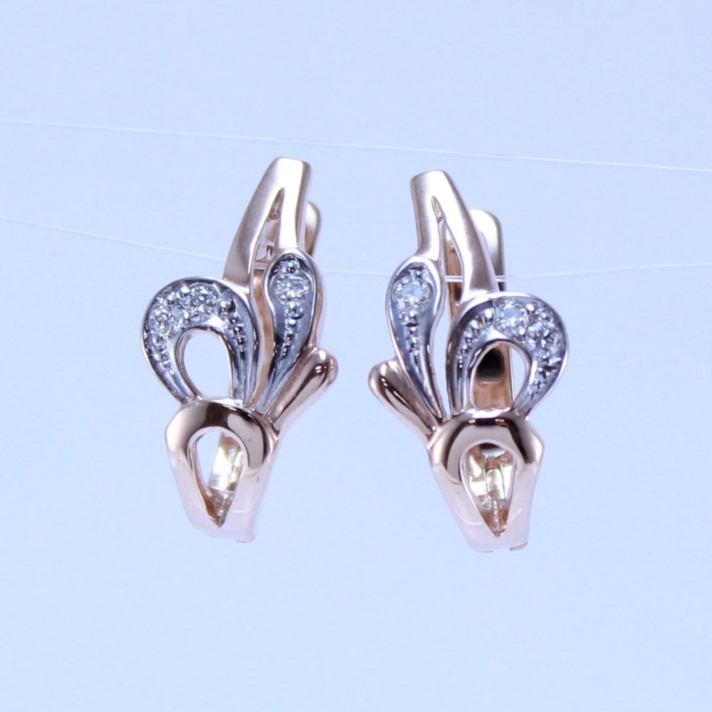 Серьги изящного ювелирного дизайна из красного золота 585 пробы декорированы вставками с натуральными бриллиантами. Плавные линии золота выгодно подчеркивают природную красоту и изысканное сияние драгоценных камней. Изумительные серьги будут прекрасным подарком, и помогут легко создать привлекательный женственный образ. Приобретайте украшение по выгодной цене в магазинах Мир Золота.