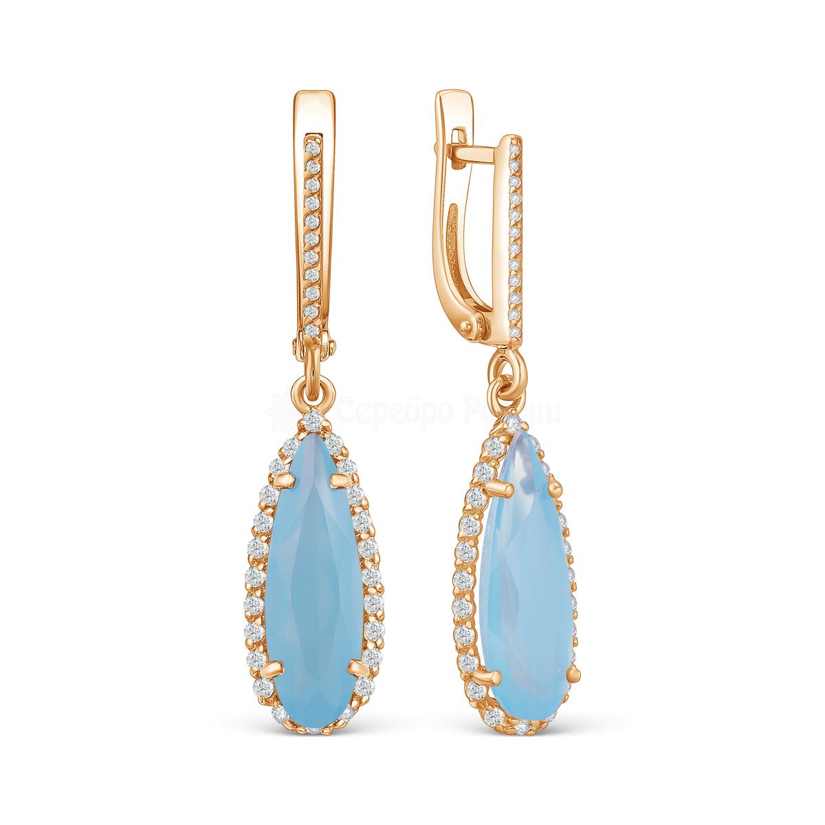 Серьги с подвесками с натуральными голубыми халцедонами и сияющими фианитами выполнены из золочёного серебра 925 пробы. Великолепные серьги с ярким акцентом крупных халцедонов грушевидной формы огранки в обрамлении кристальных фианитов эффектно смотрятся, и позволят создать неповторимый женственный образ. Приобретайте серьги для своей коллекции или в подарок по выгодной цене в магазинах Мир Золота.