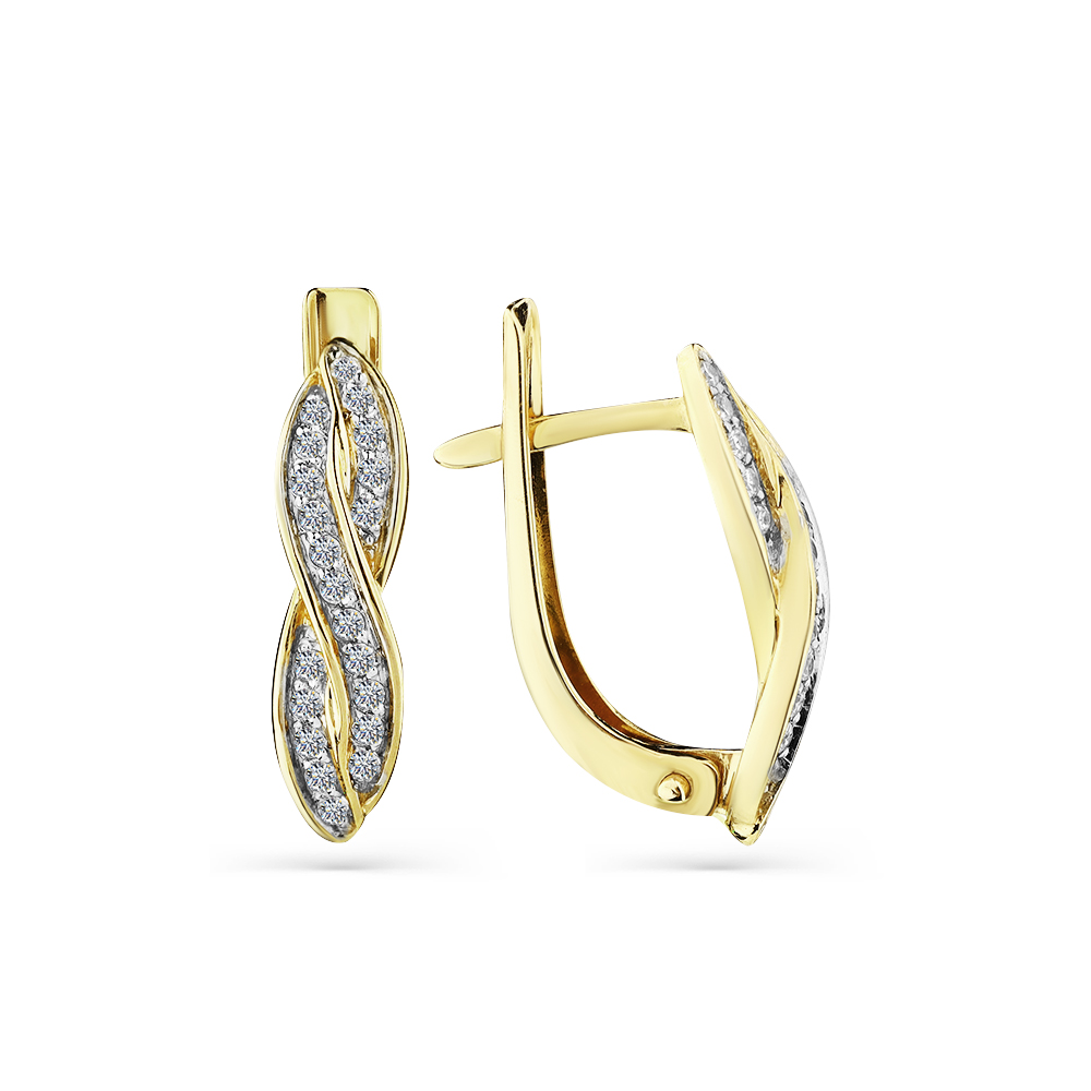 Серьги из желтого золота 585 пробы с изящными дорожками сияющих фианитов отлично впишутся в образы современной леди. Украшение привлекательного дизайна с кристальным блеском камней очень женственно смотрится, и подчеркнет изысканный вкус владелицы. Тип замка: английский, комфортный и надежный в использовании. Приобретайте серьги по выгодным ценам в магазинах Мир Золота.