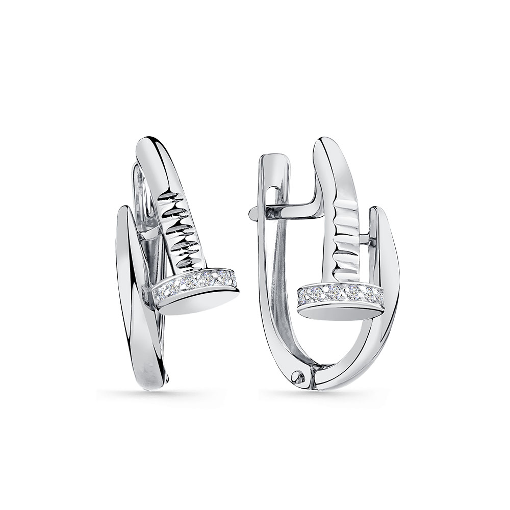 Стильные серьги оригинального ювелирного дизайна с прозрачными фианитами выполнены из белого золота 585 пробы. Актуальный дизайн в виде гвоздя с искристым блеском камней станет заметным акцентом модного образа.и подчеркнет изысканный вкус владелицы. Тип замка - английский. Приобретайте серьги по выгодной цене в магазинах Мир Золота.