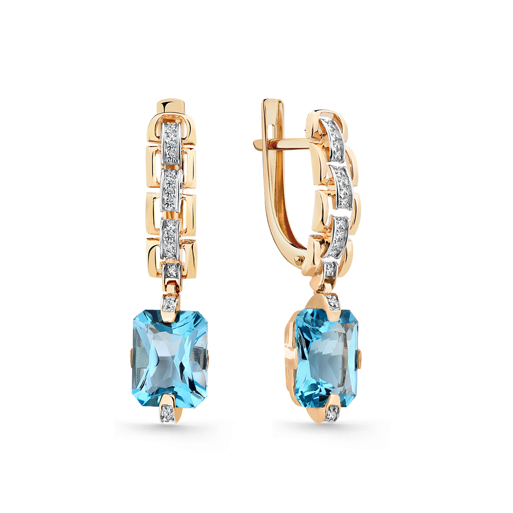 Стильные серьги с подвесками с великолепными топазами swiss и вставками с кристальными фианитами выполнены из красного золота 585 пробы. Современный ювелирный дизайн с восхитительным блеском лазурных камней привлекает внимание, и позволит создать изысканный женственный образ. Приобретайте серьги с английским замком по выгодным ценам в магазинах Мир Золота.